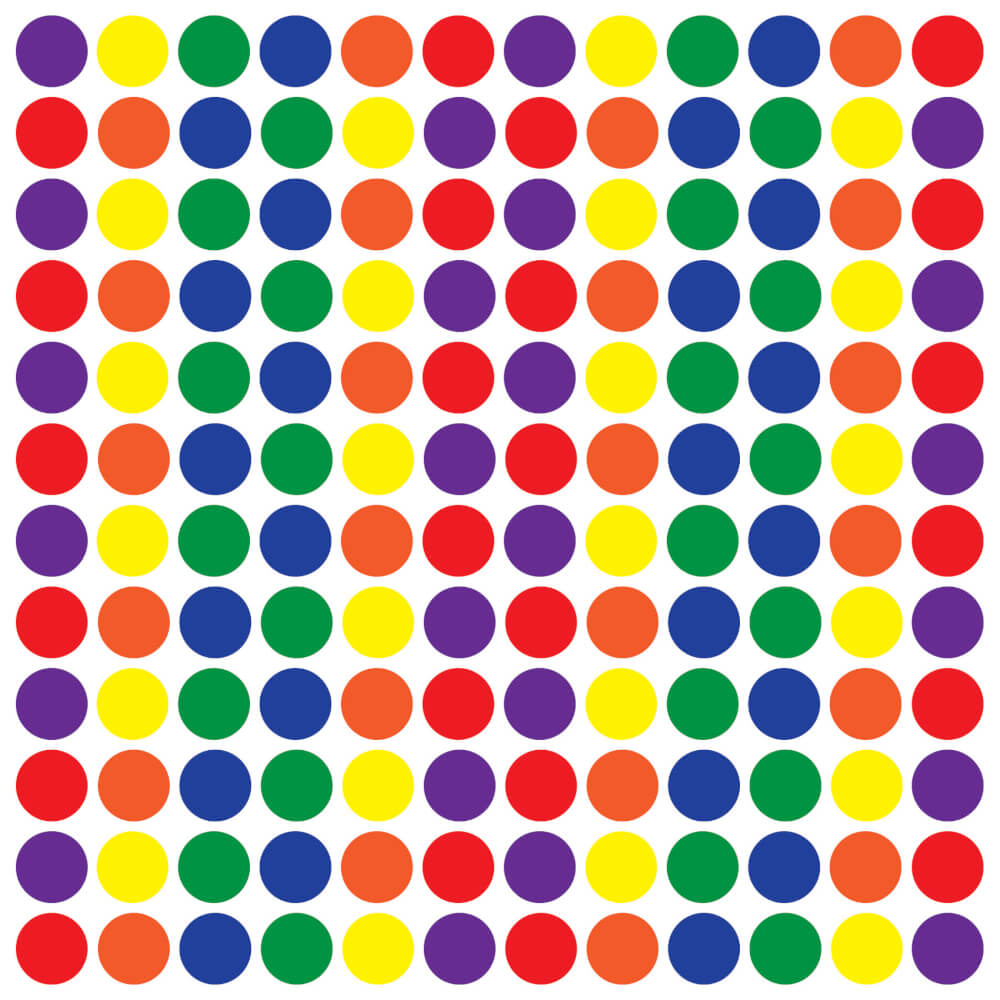 – As cores dos adesivos são vermelho, laranja, verde, azul, roxo e amarelo.