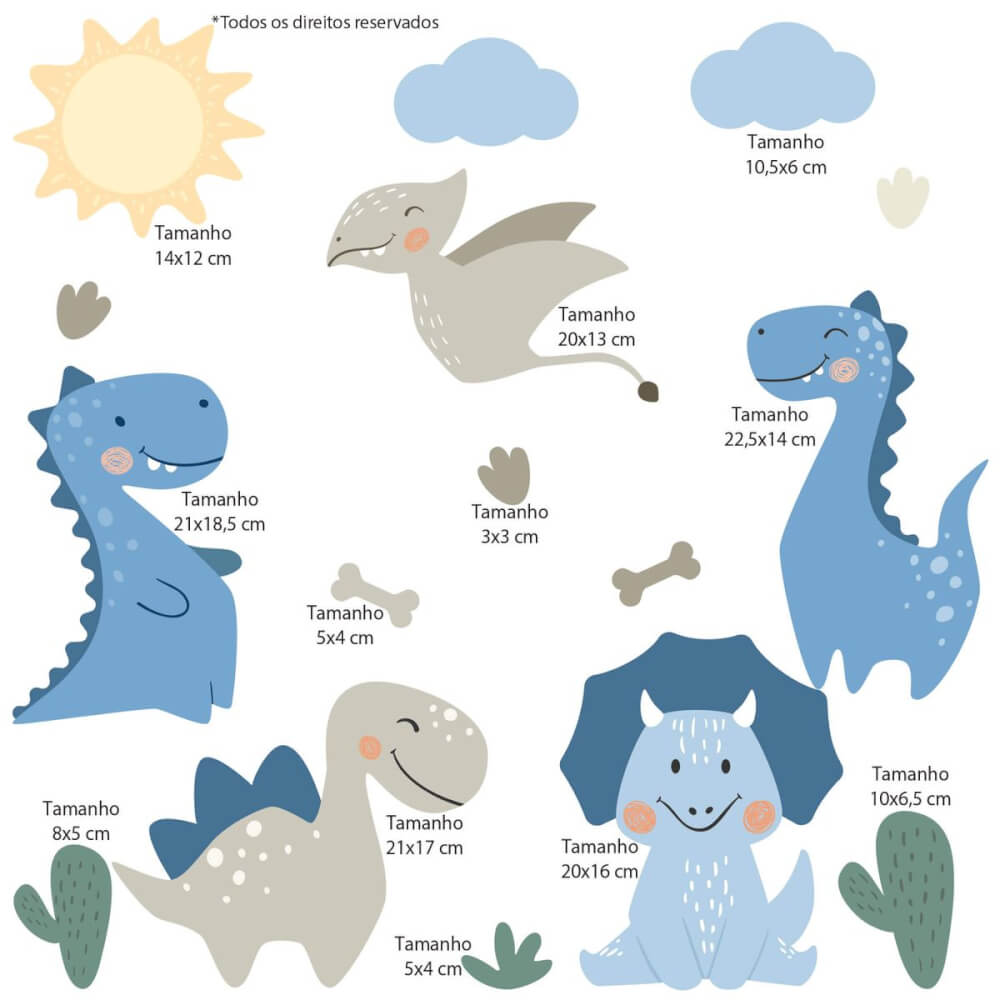 Características e dimensões do Adesivo de Parede Infantil Dinossauros Jurassic Baby Azul