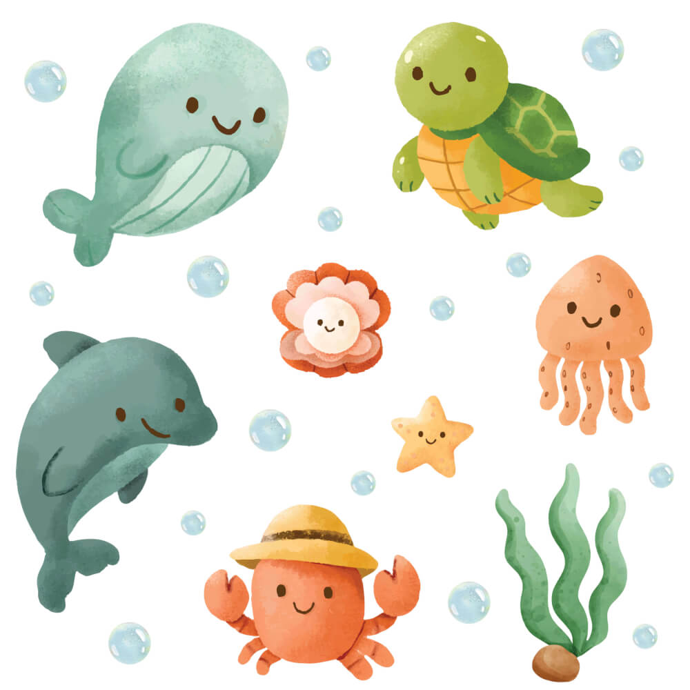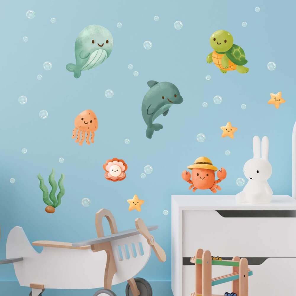 Adesivo de Parede Infantil Animais Fundo do Mar Aquarela Colorido
