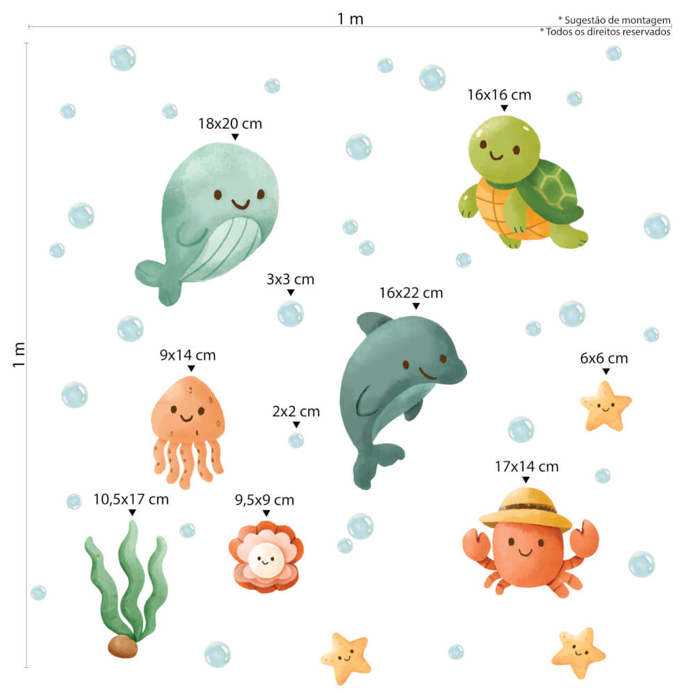 Características e dimensões do Adesivo de Parede Infantil Animais Fundo do Mar Aquarela Colorido