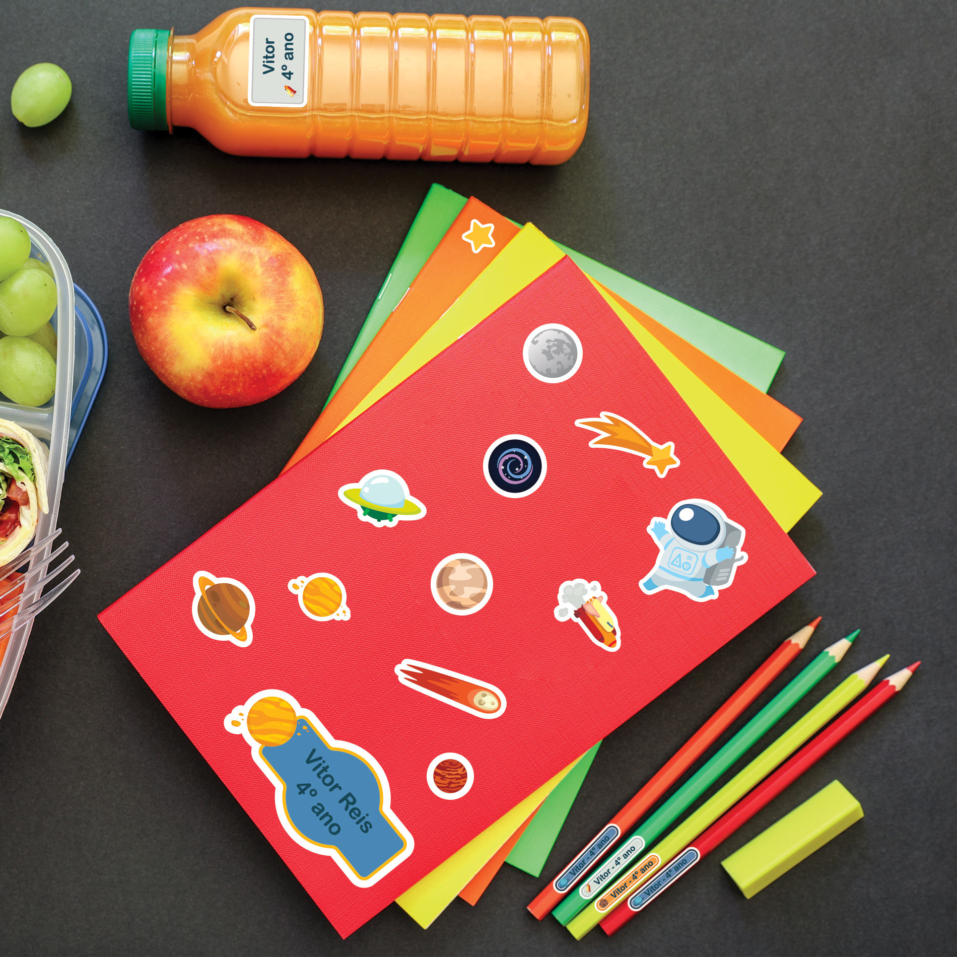 As etiquetas escolares são à prova d’água e podem ser coladas em copinhos, estojos de escova de dentes, etc.