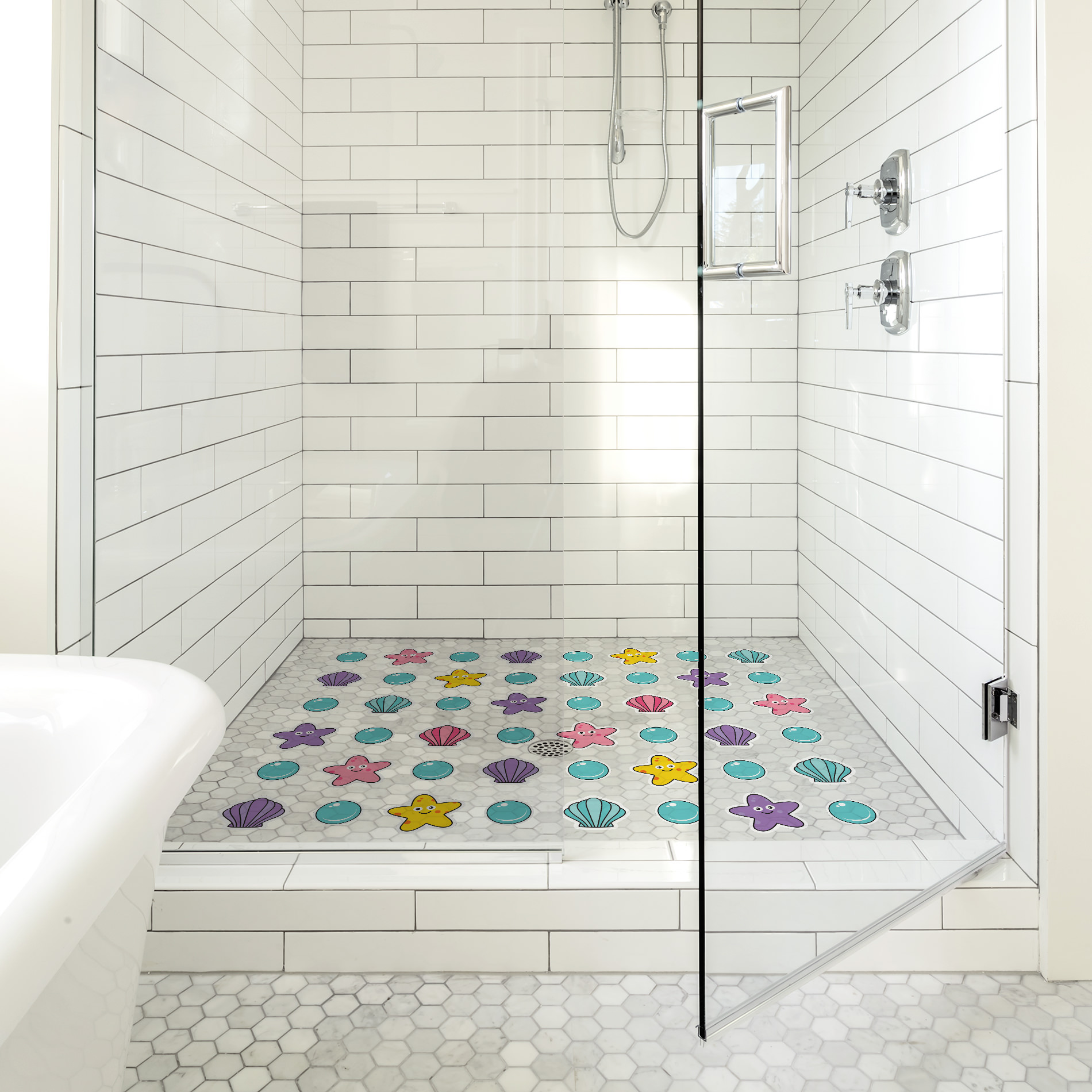 Adesivos antiderrapantes infantis coloridos aplicados em piso de banheiro com desenhos de estrelas do mar, conchas e bolhas