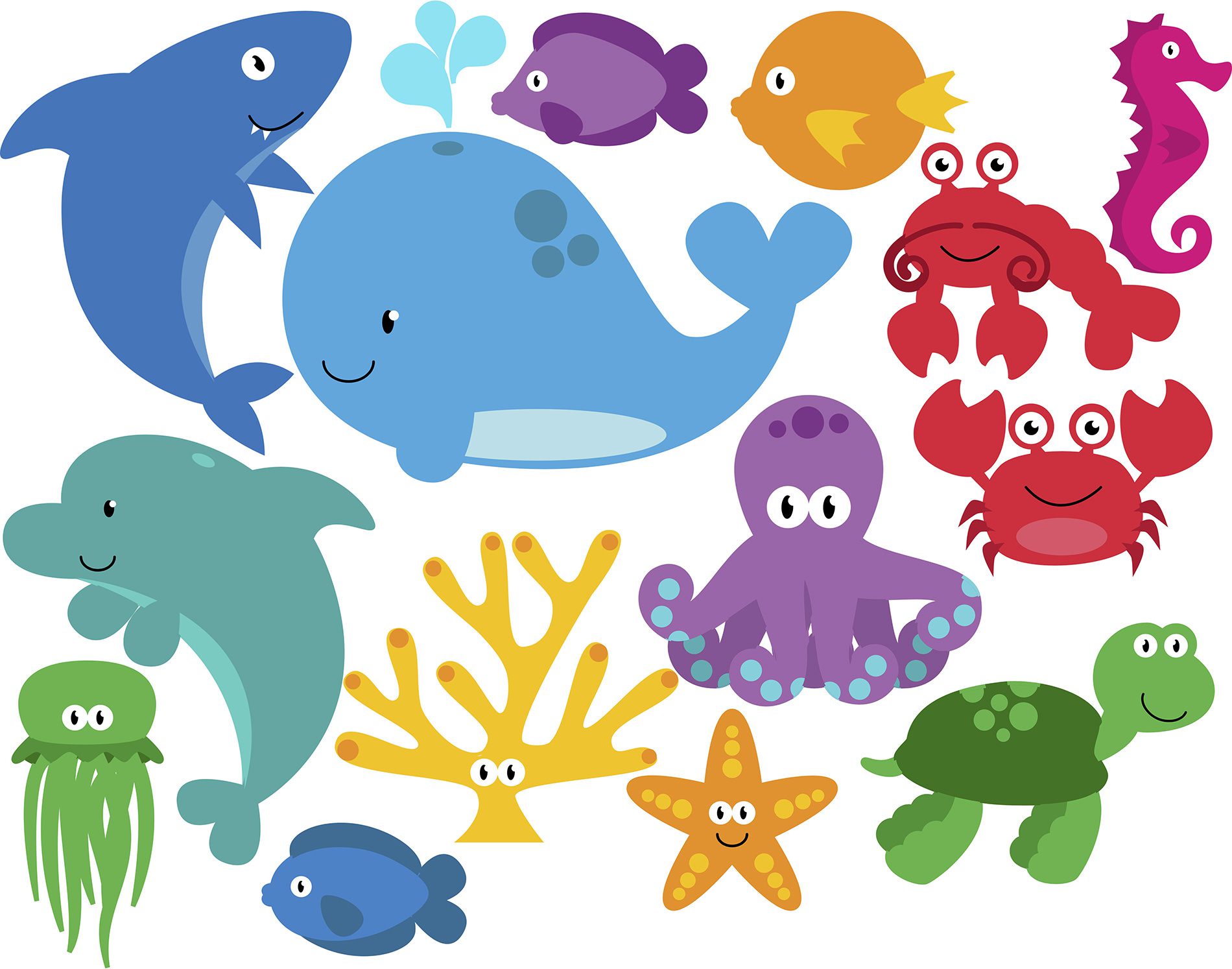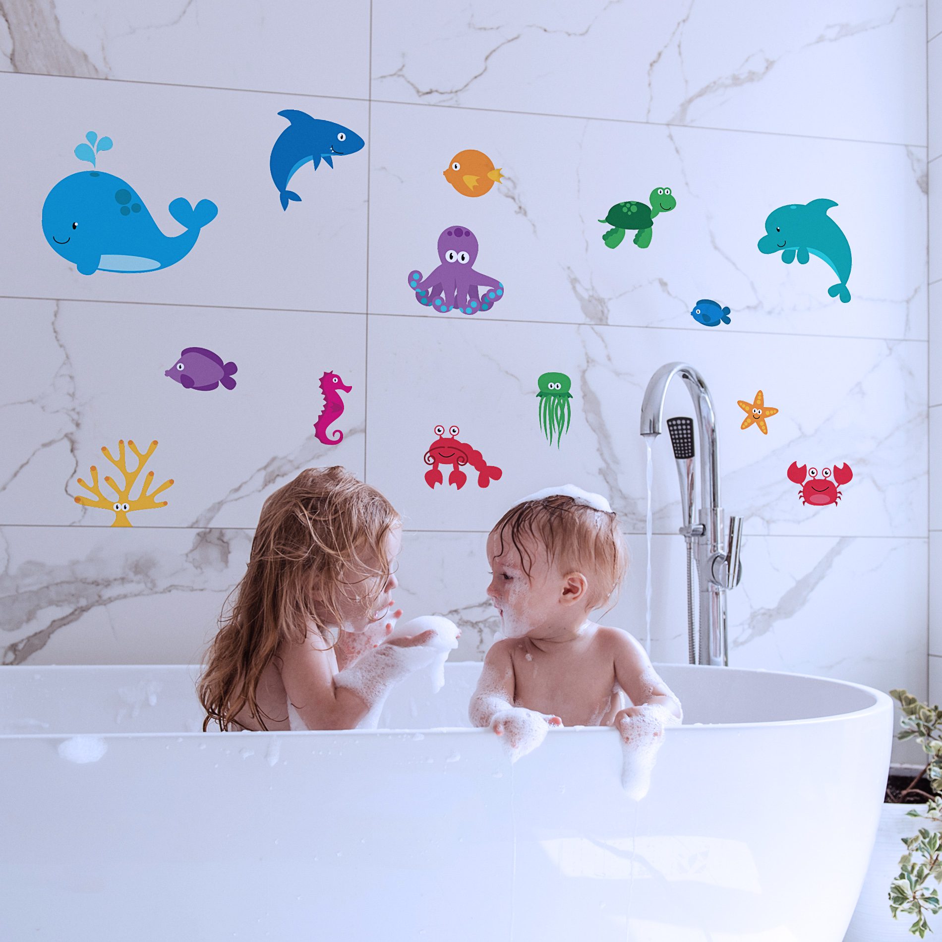 O kit adesivo de parede infantil fundo do mar contém 14 adesivos de animais, sendo eles: