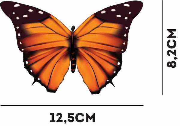 – São 19 borboletas de aproximadamente 10x10cm cada uma. Podem ser dispostas próximas ou espalhadas de acordo com o espaço disponível para aplicação.