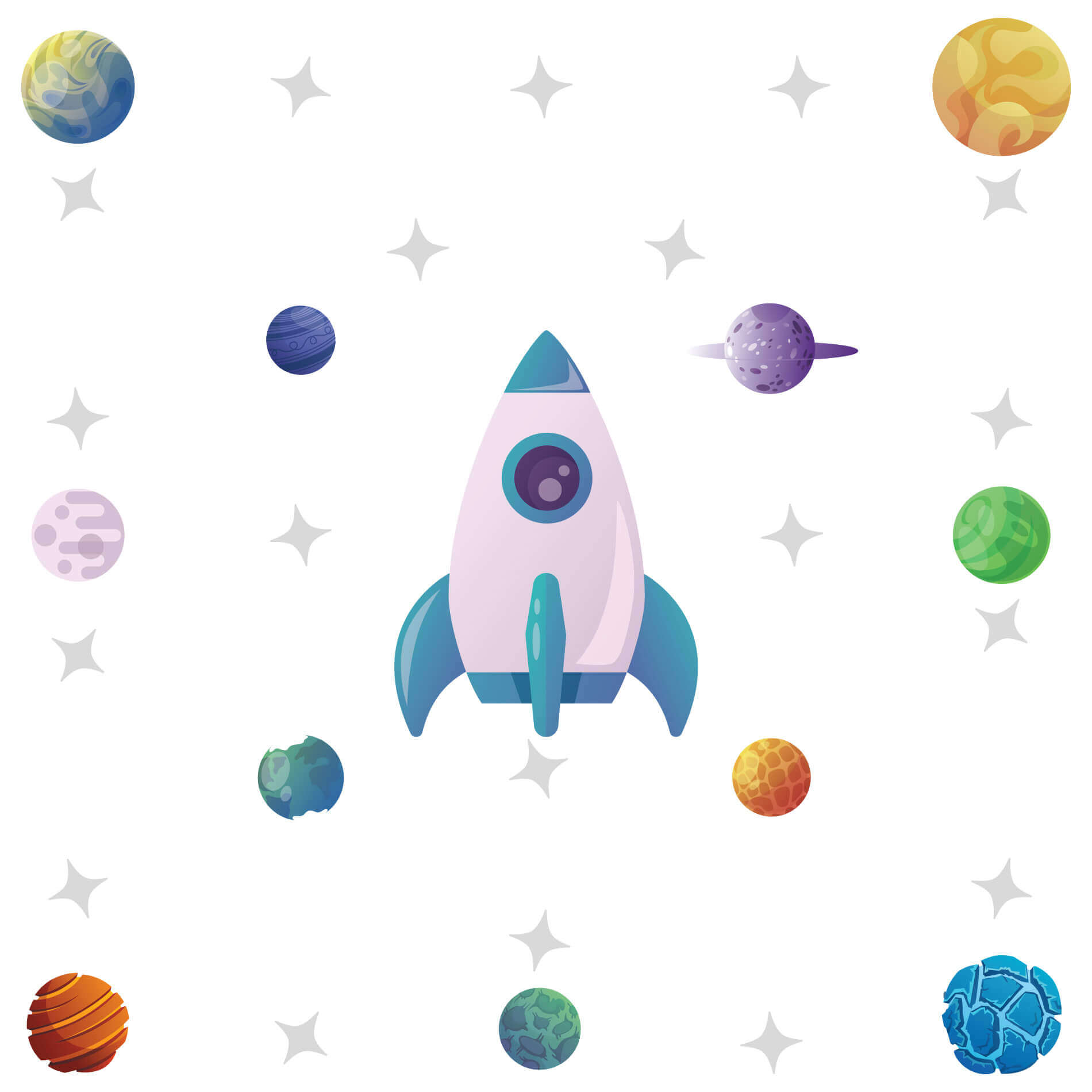 • Design Lúdico: O Adesivo de Parede Espaço Foguete traz um foguete lilás e planetas coloridos, criando um ambiente divertido e encantador para os pequenos.