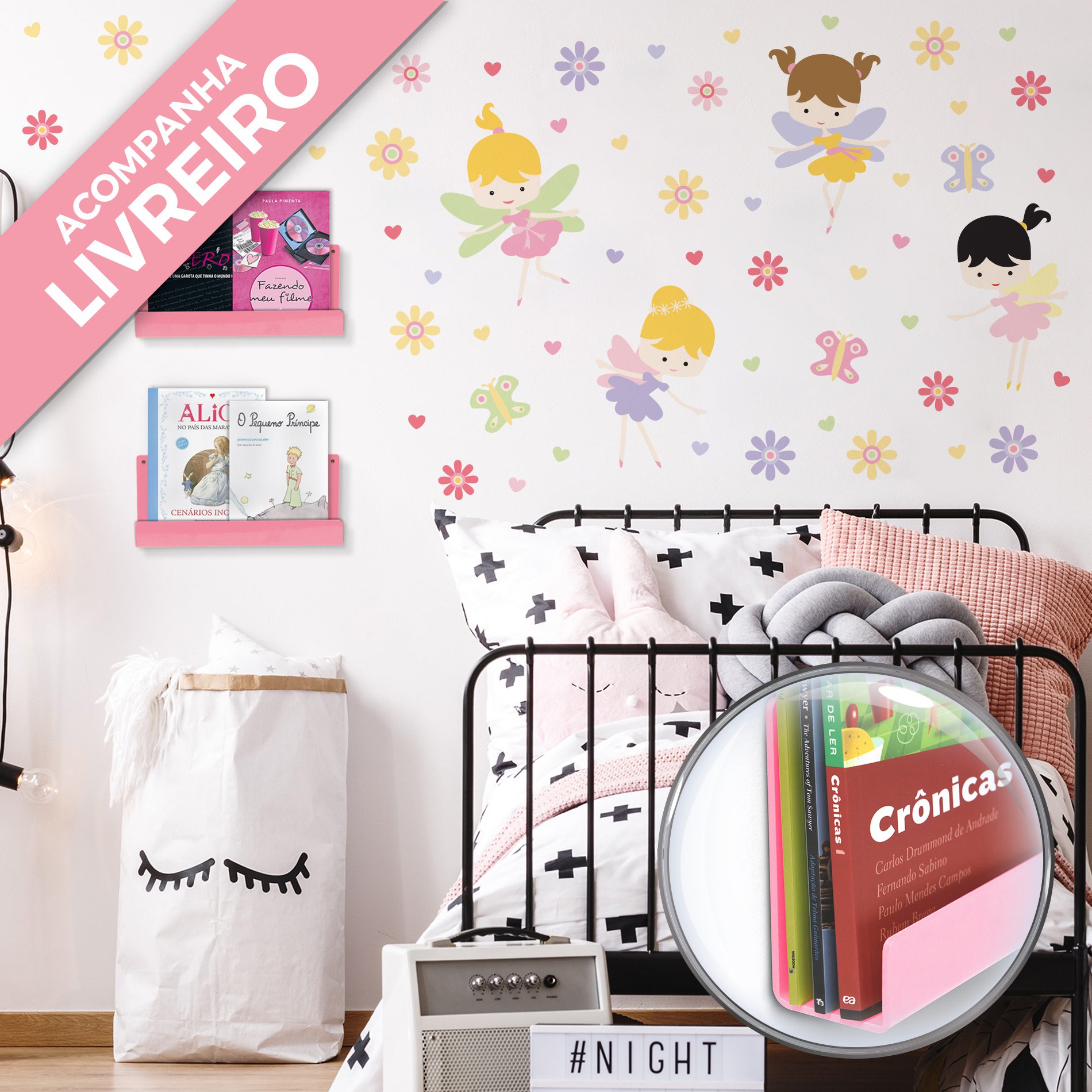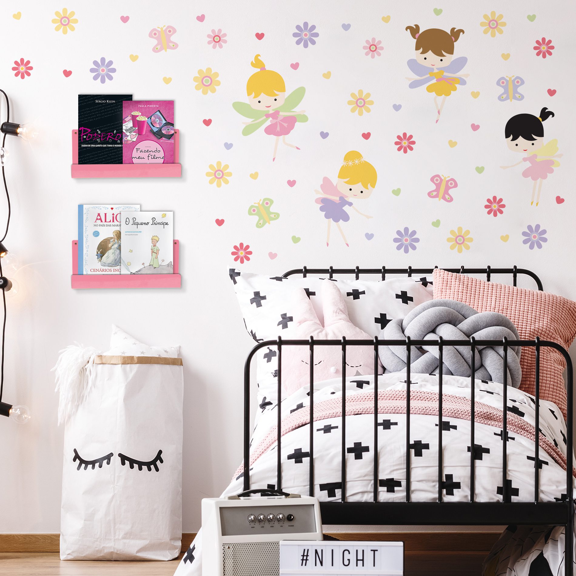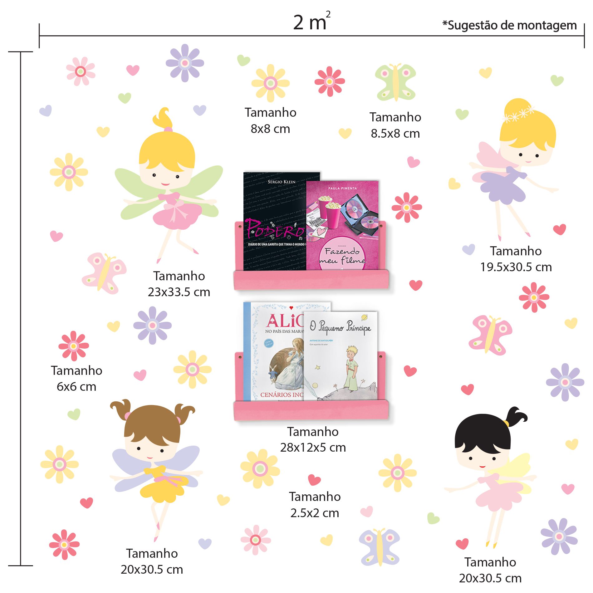 Características e dimensões do Adesivo de Parede Quarto Infantil Fadas e Livreiros Rosa: