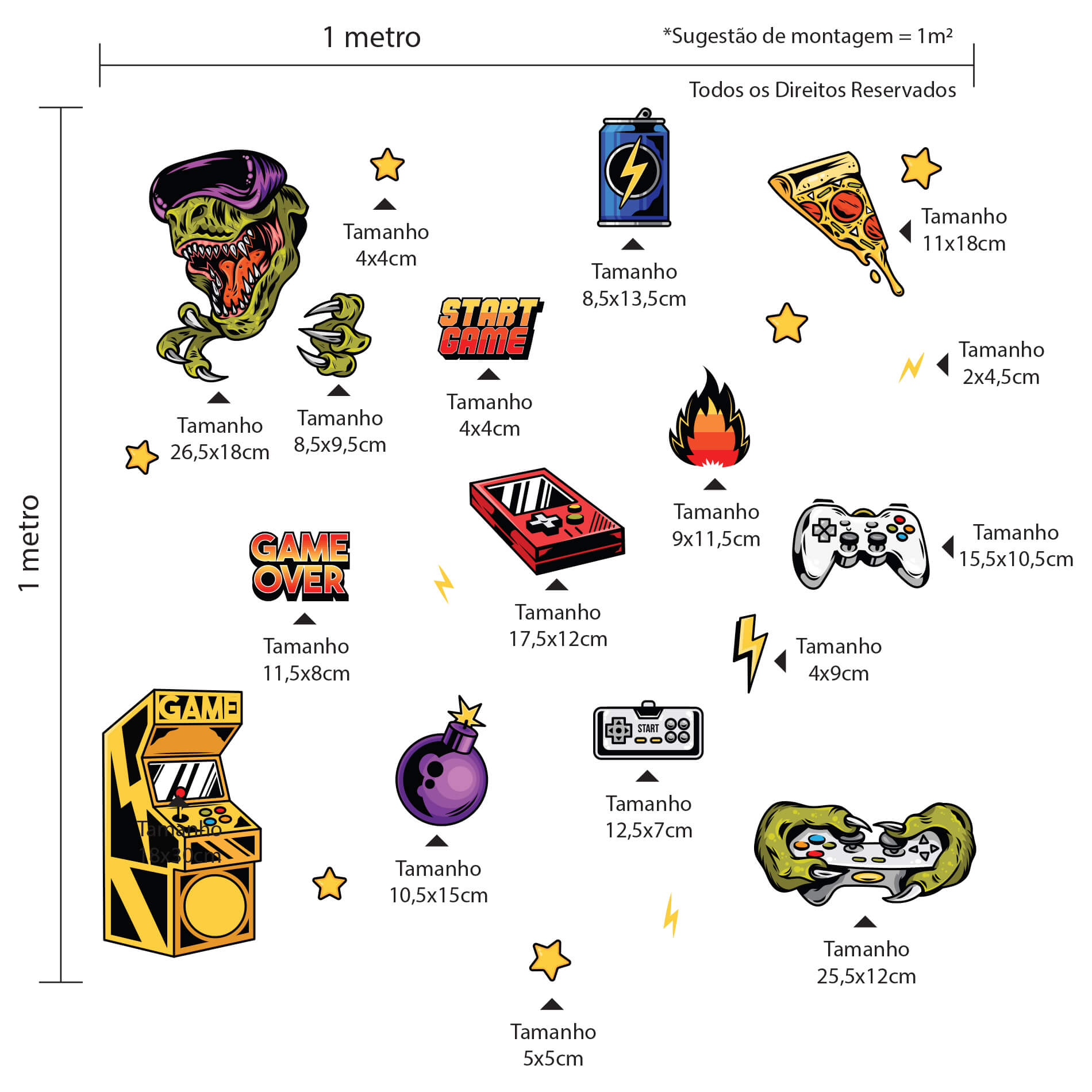 Os adesivos vêm recortados e você mesmo distribui os desenhos como preferir, isso facilita a aplicação evitando a formação de bolhas e promovendo um perfeito acabamento. Decore quarto gamer de maneira muito mais agradável e fácil!