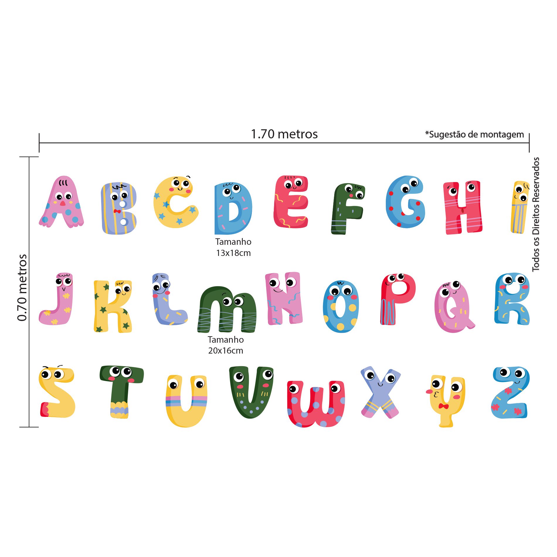 O kit de adesivo de parede infantil alfabeto possui 26 adesivos cortados individualmente, sendo eles: