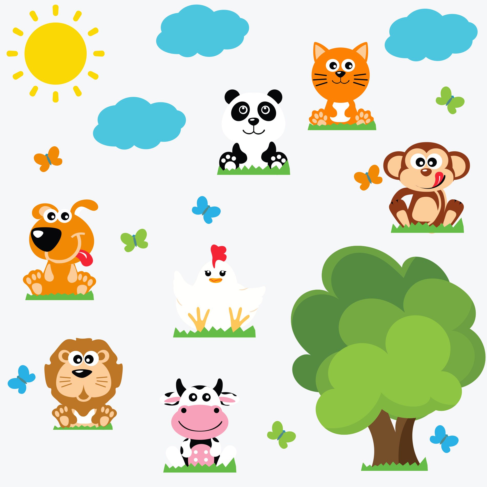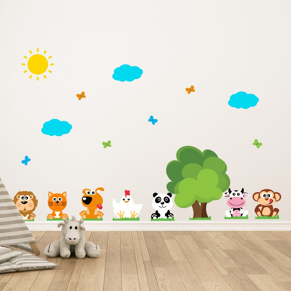 • Tema Lúdico: O Adesivo de Parede Infantil Árvore Fazendinha apresenta desenhos coloridos de animais como leão, gato, cachorro e galinha, criando um ambiente divertido e alegre para as crianças.