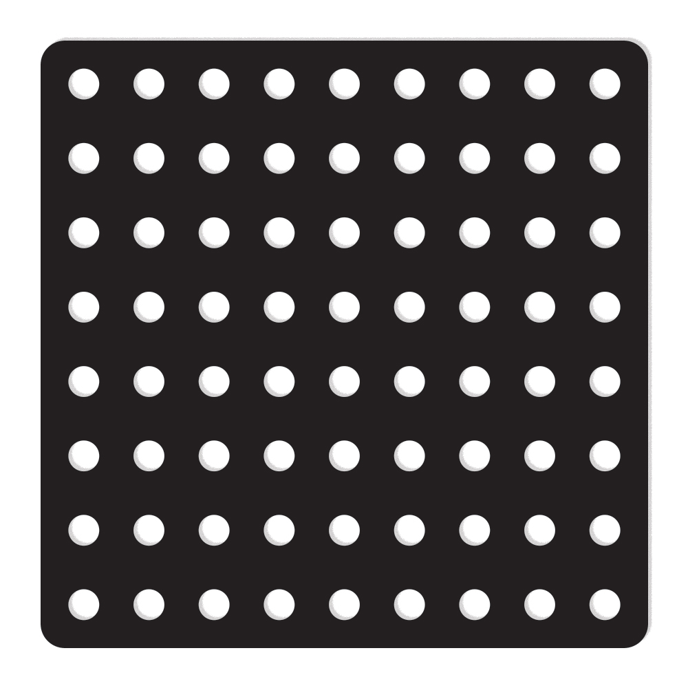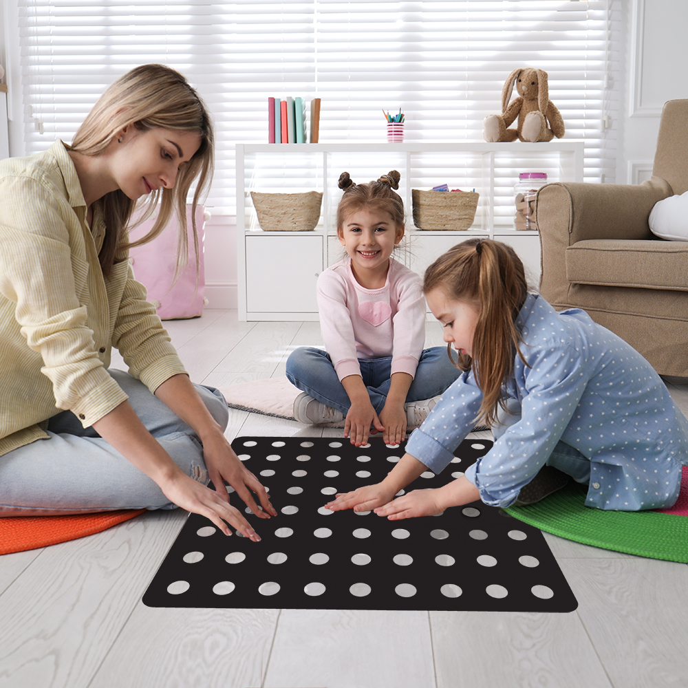 Imagem técnica do adesivo de parede infantil jogo do pontinho, quadrado preto de 50x50 cm com pontos brancos organizados.