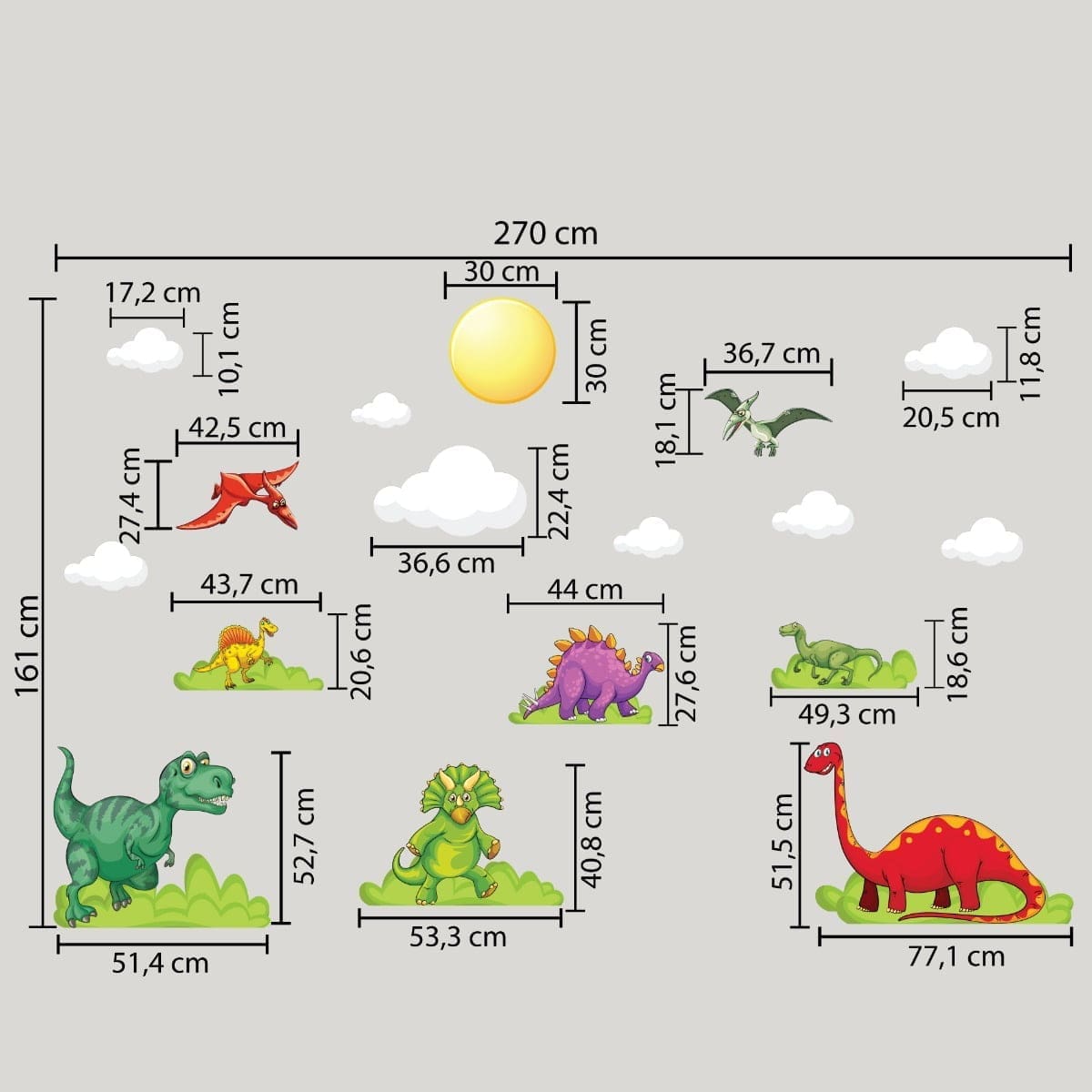 O kit possui ao todo 17 adesivos de parede, sendo 8 dinossauros, 8 nuvens e 1 sol.