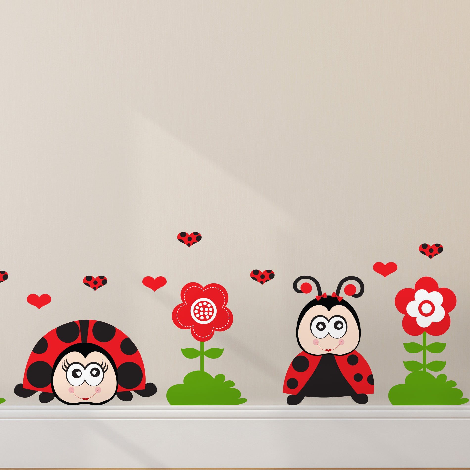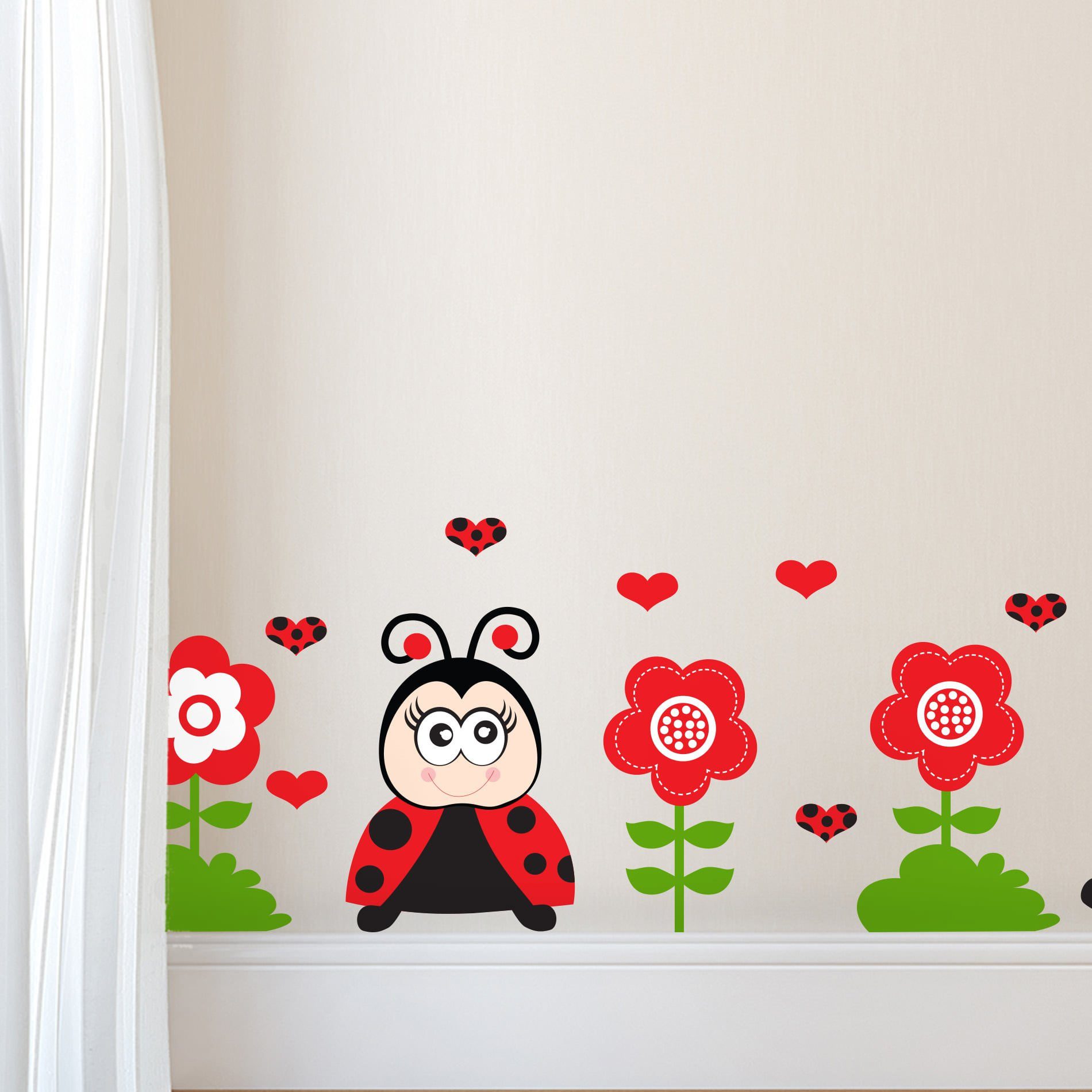 O kit é composto por 26 adesivos de parede infantis ao todo, sendo: 3 joaninhas, 14 corações, 5 flores e 4 gramas.