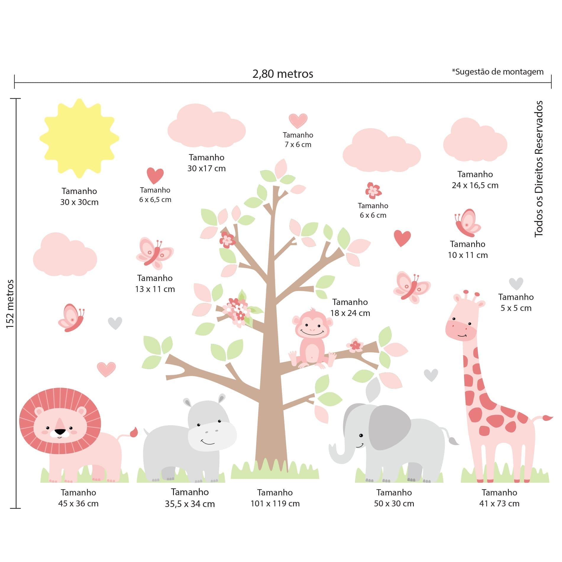 Dimensões e Características do Adesivo de Parede Infantil para Quarto Safari Menina: