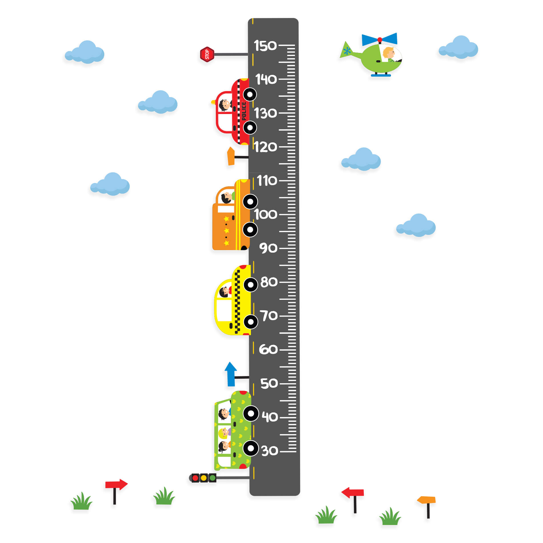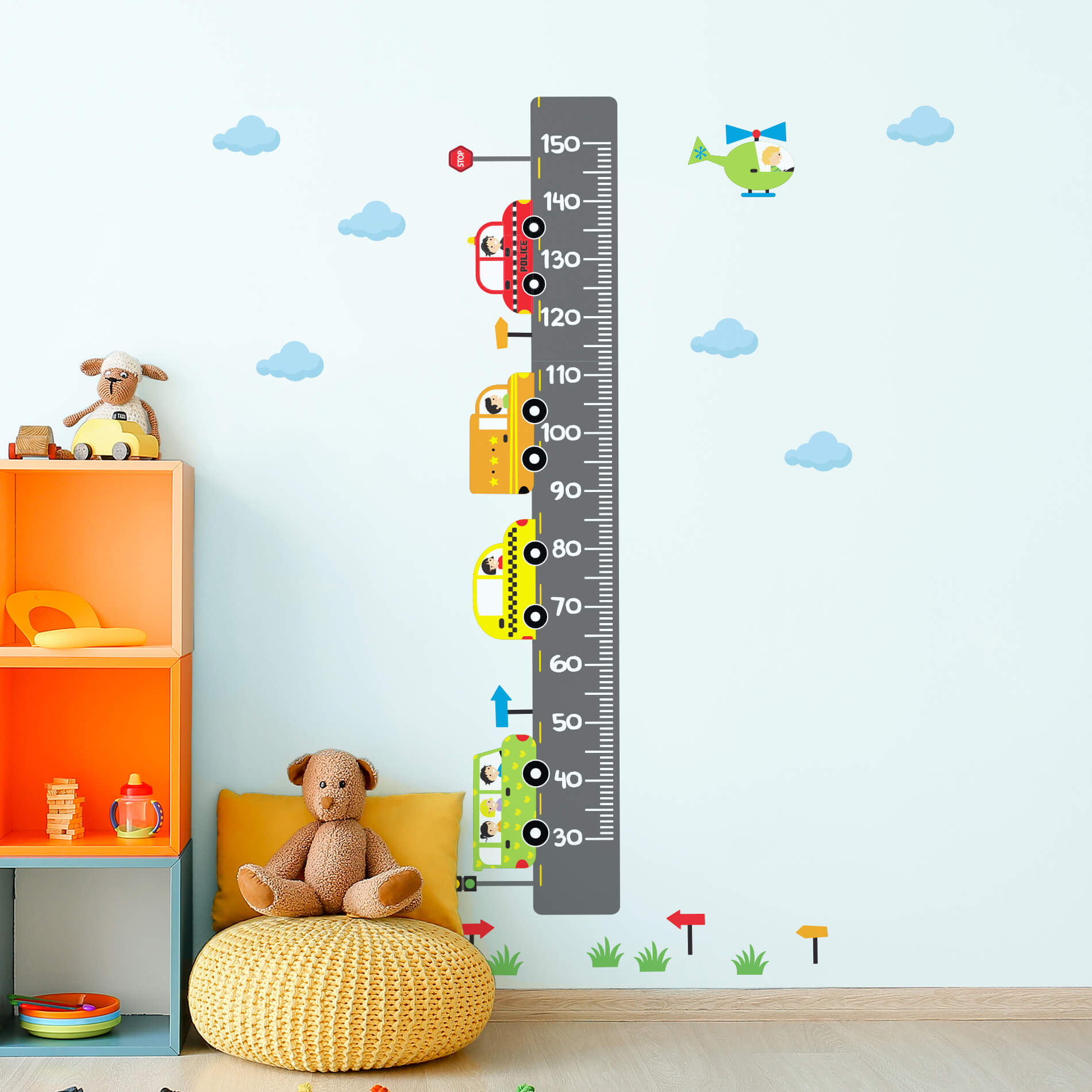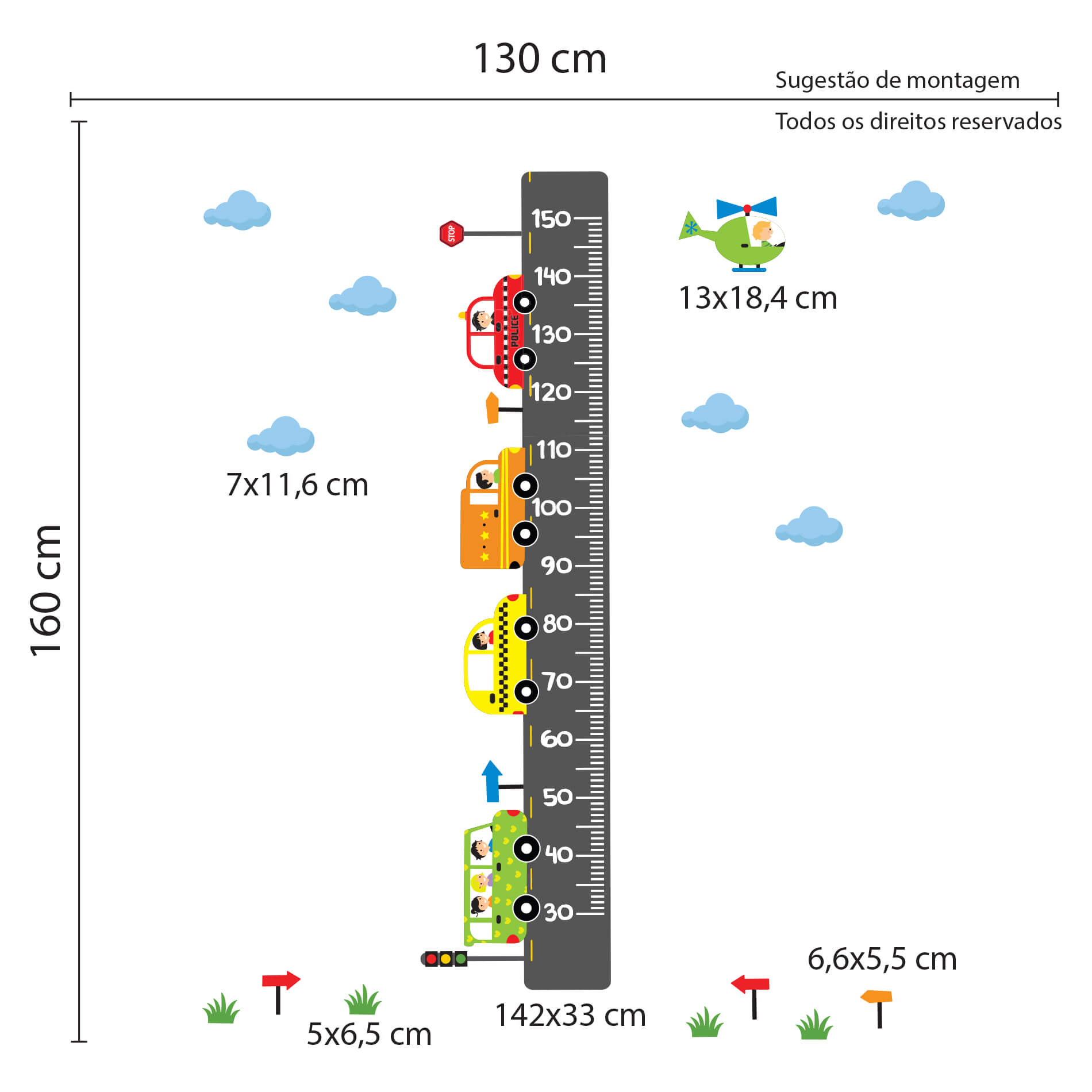 – 1 adesivo de régua de crescimento com carrinhos tamanho de 142×33 cm;