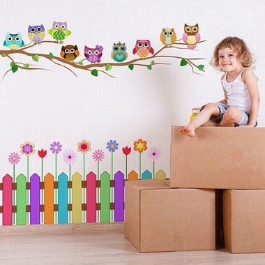 Um galho com várias corujinhas amigas e uma charmosa cerquinha cheia de flores montam um cenário encantador para ser aplicado no quarto das crianças ou na brinquedoteca. As crianças vão se identificar com o adesivo de parede e se divertir num ambiente convidativo e estimulante.