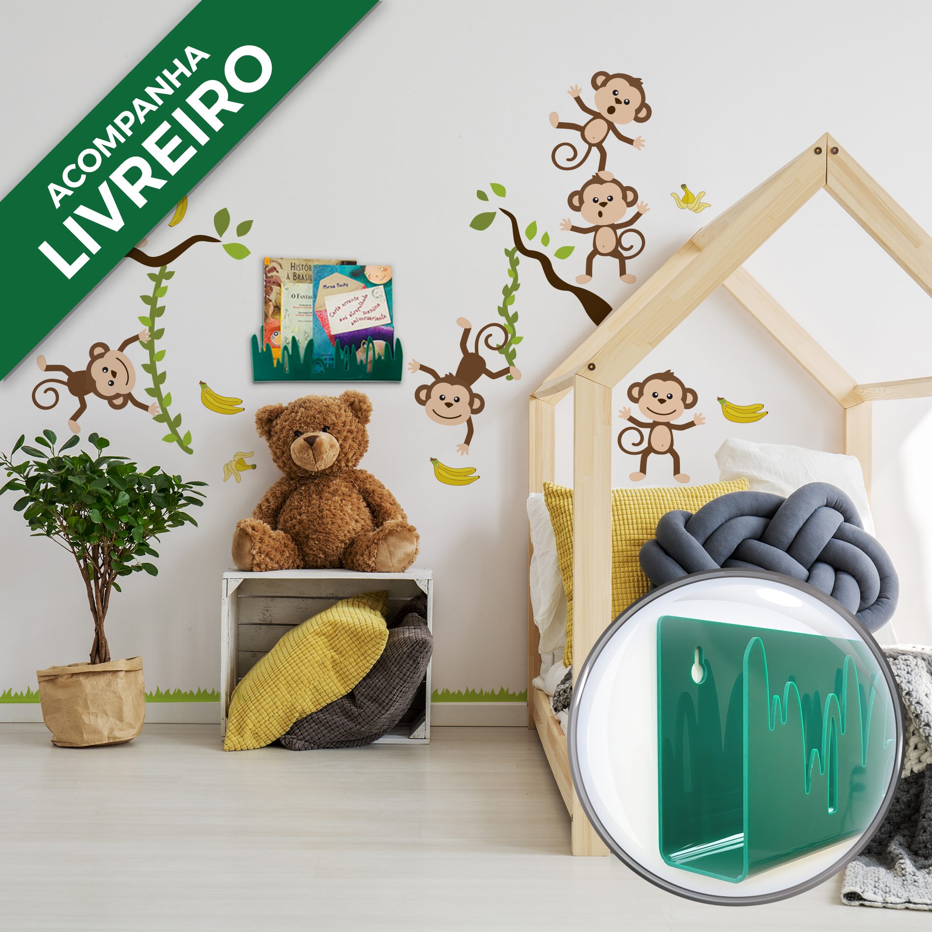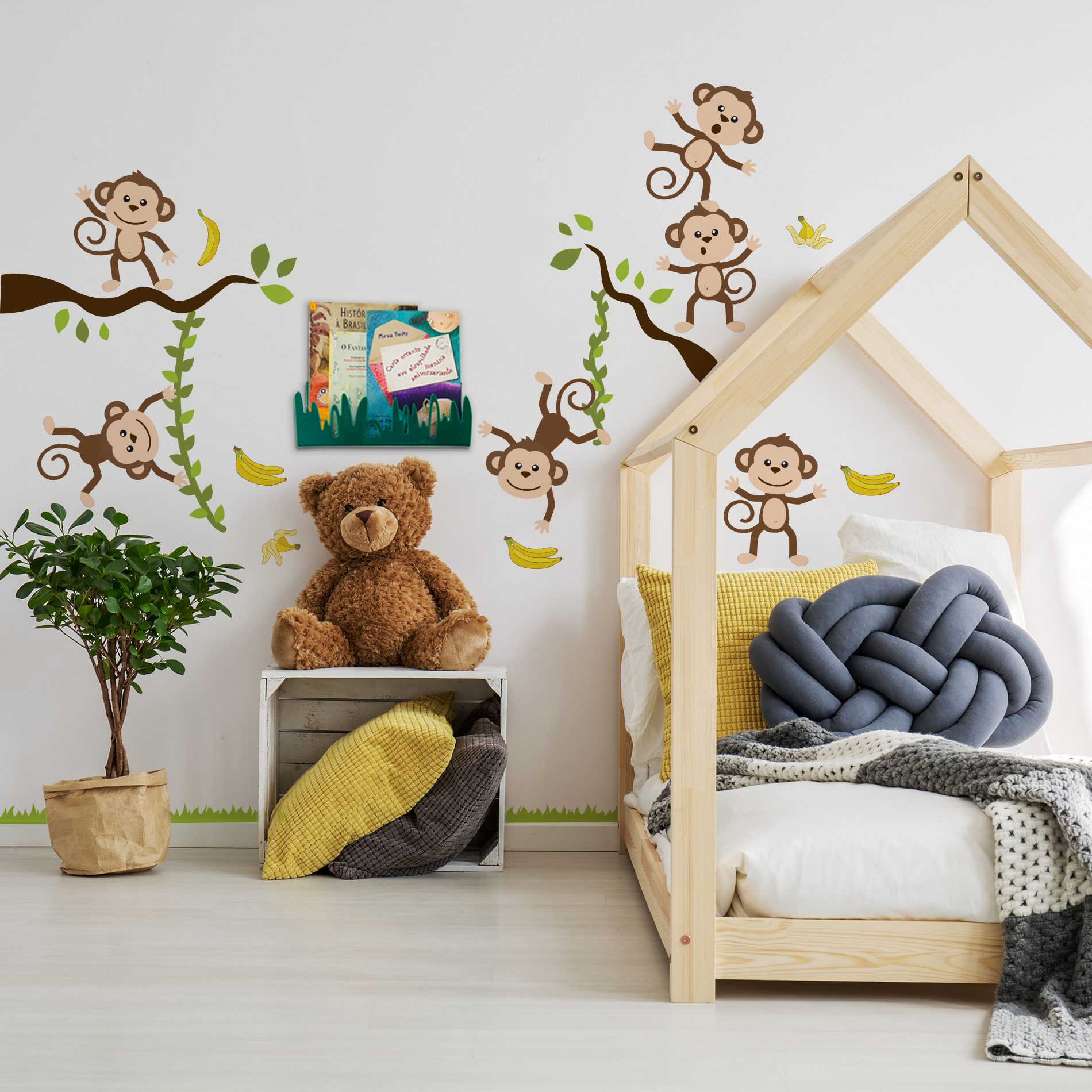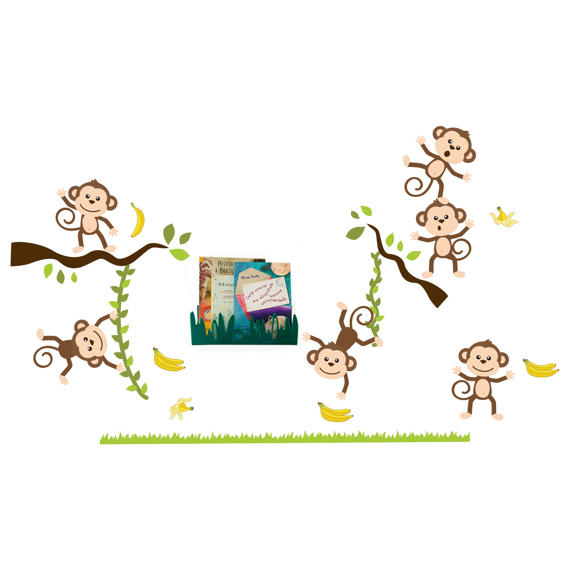 Adesivo de Parede Quarto Infantil Macacos com Livreiro Grama