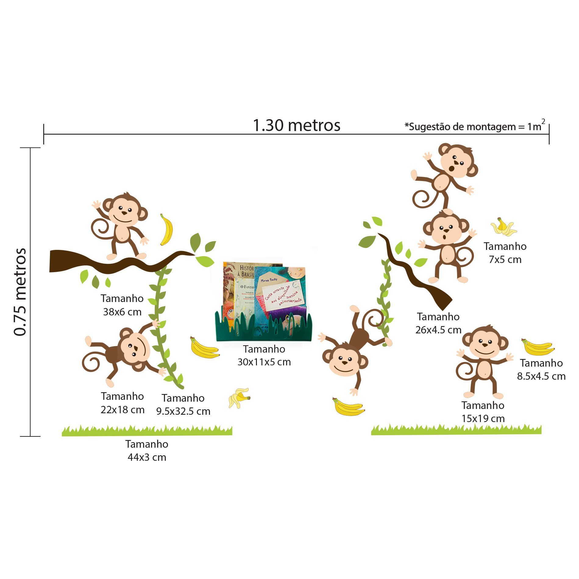 Características e dimensões do Adesivo de Parede Macacos e Livreiro: