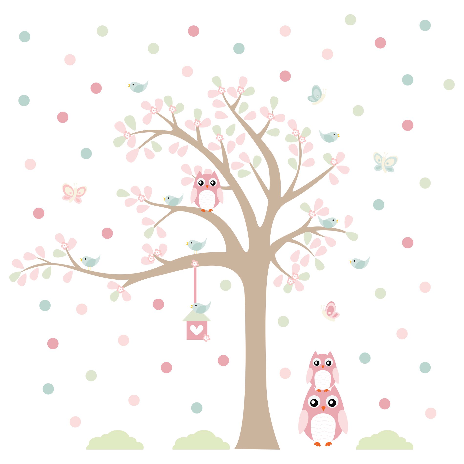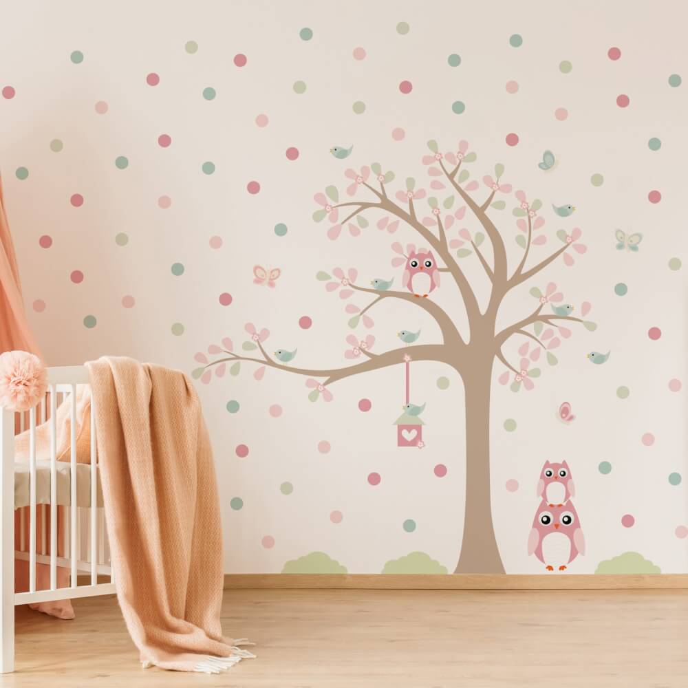 Kit do Adesivo de parede árvore Coruja Baby com adesivos de Bolinhas combinando.