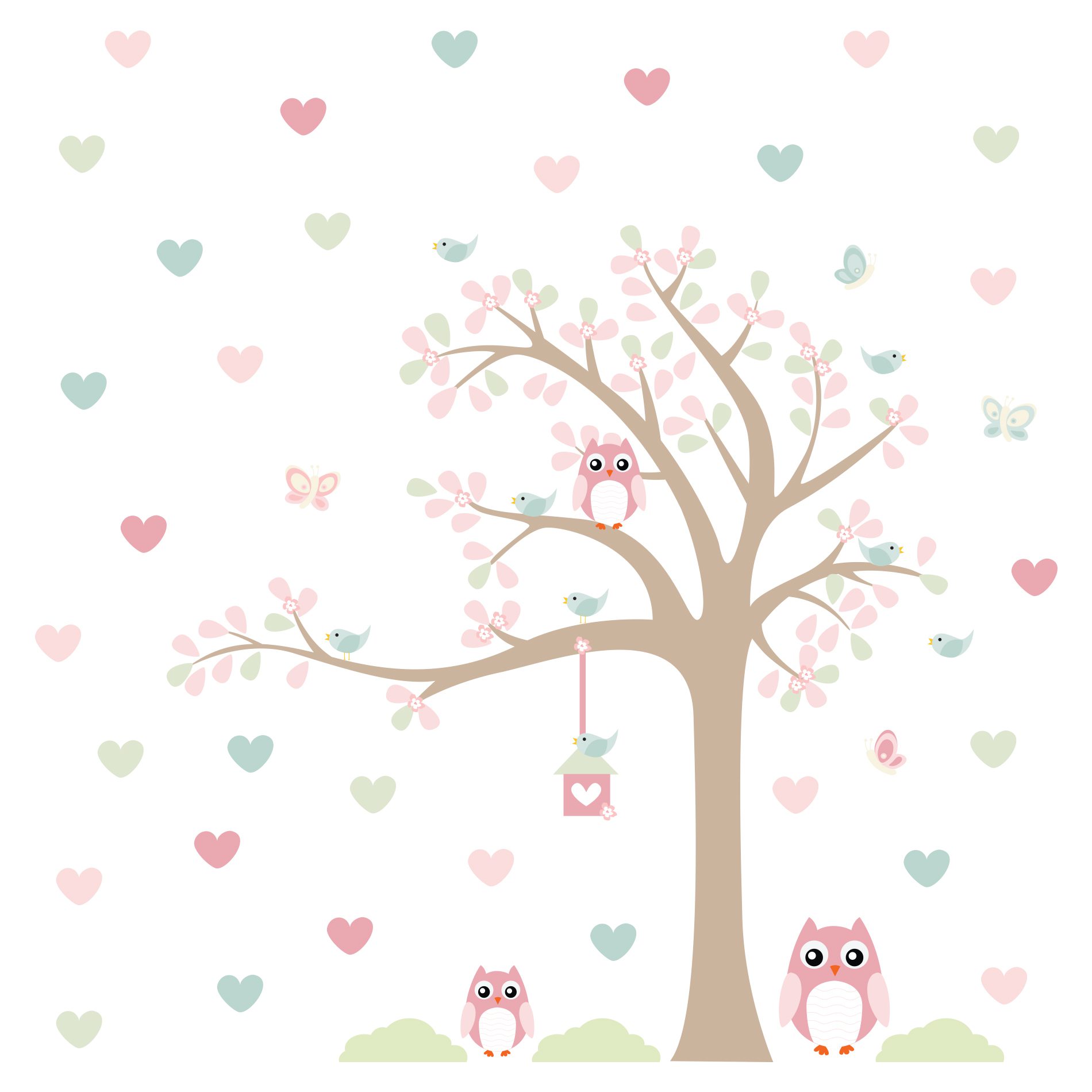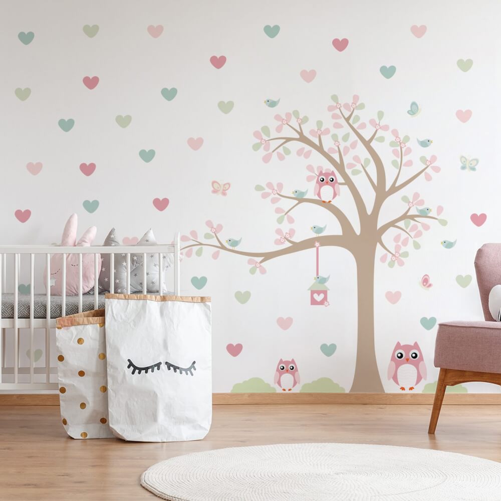 Com o tema de uma encantadora árvore, corujas adoráveis e corações suaves, esse adesivo é ideal para trazer um toque especial ao ambiente. Seja para decorar o quarto de um bebê, de uma criança ou até mesmo de uma adolescente, ele conquista o coração de todos com sua delicadeza e charme.