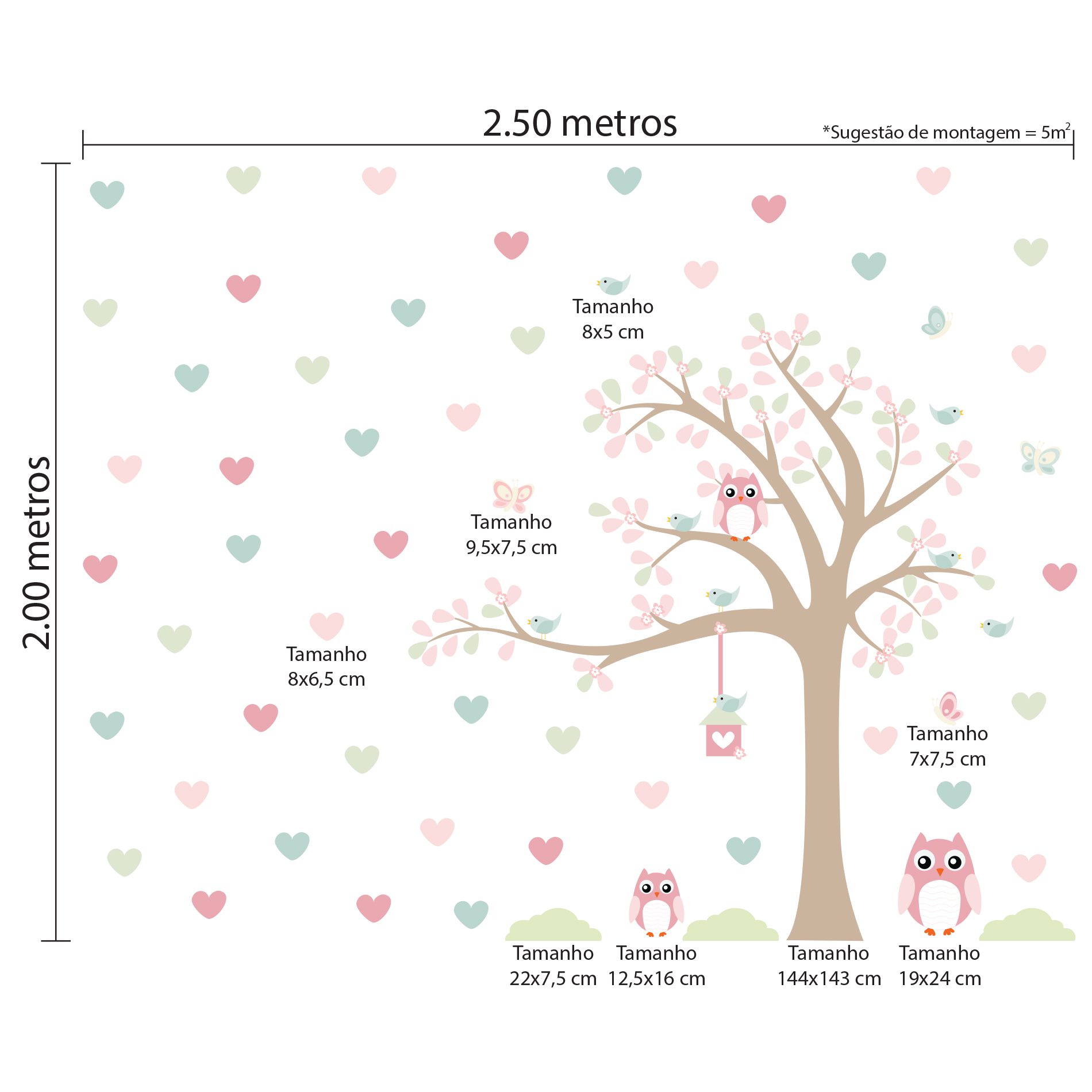 Dimensões do Adesivo de Parede Corações Rosa e Verde