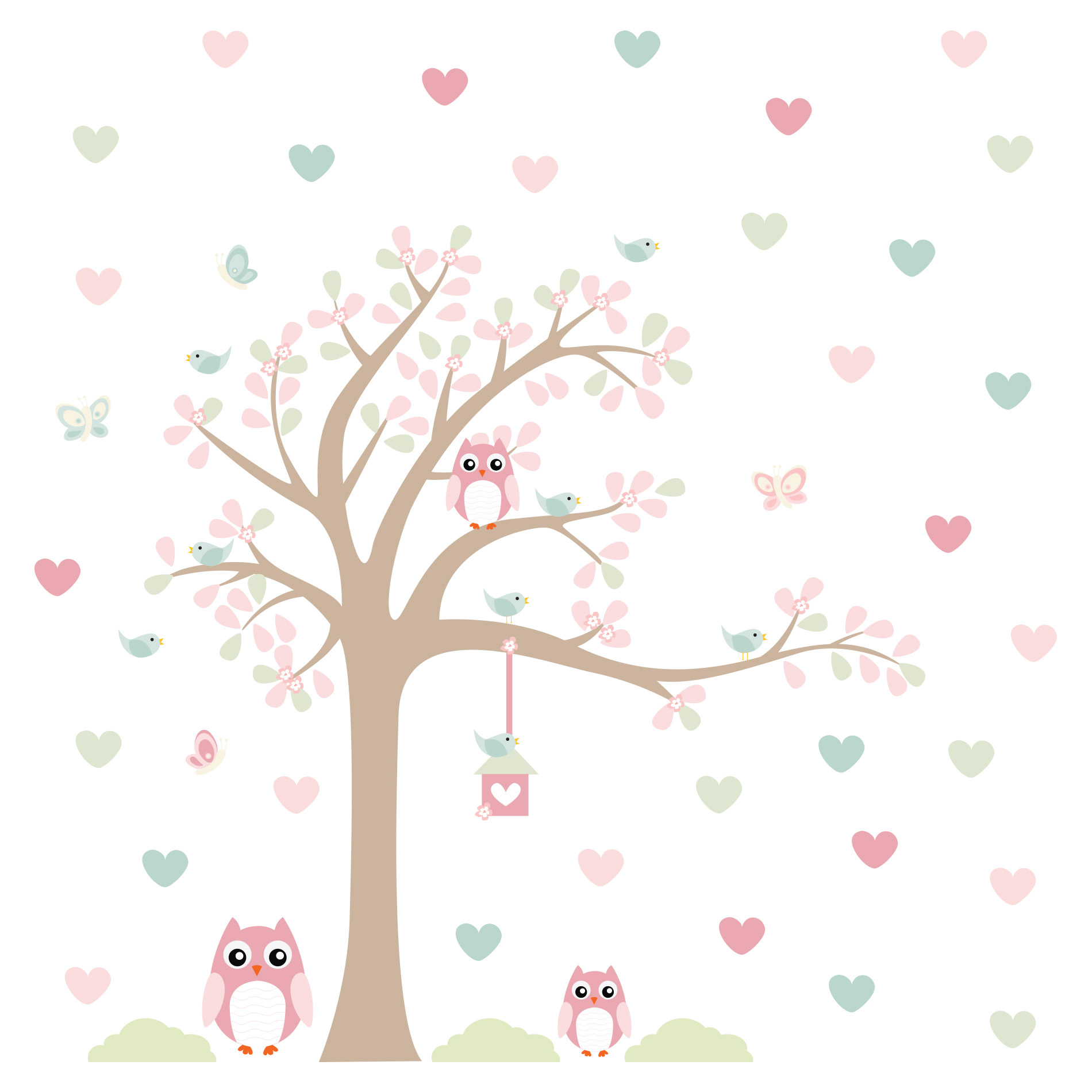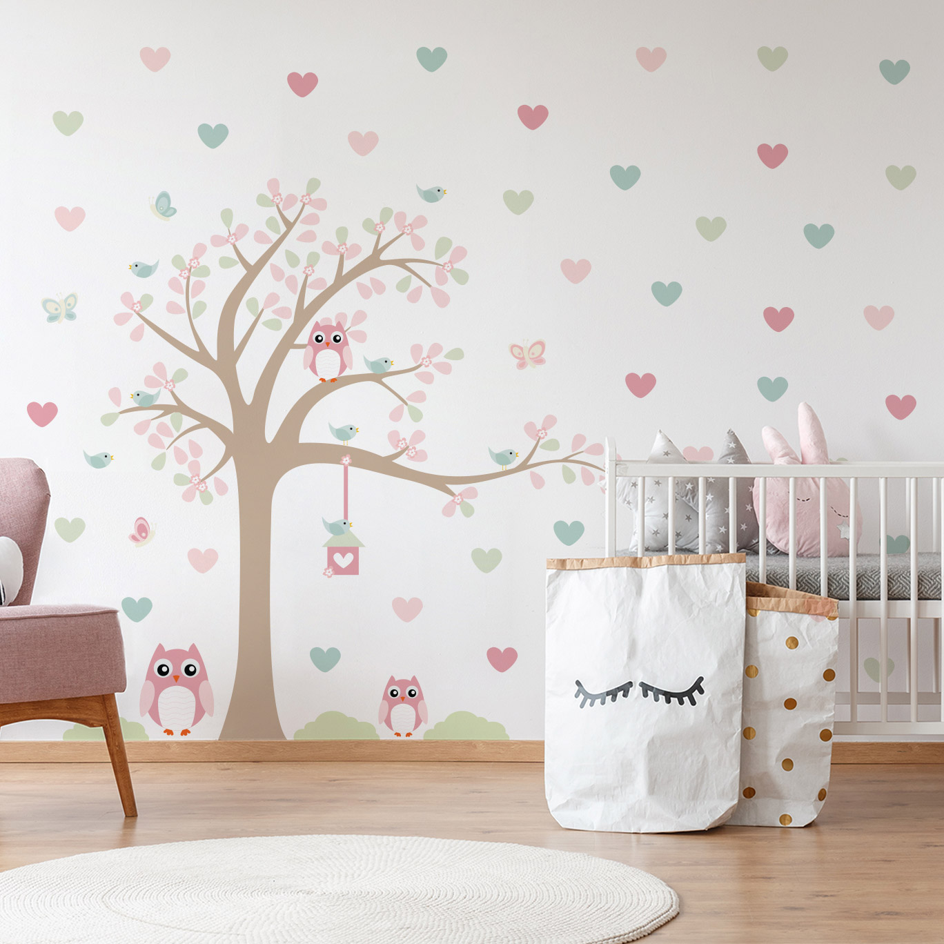 Crie um ambiente acolhedor com o Adesivo De Parede Árvore Coruja e Corações. Espalhe amor e alegria no quarto do seu pequeno! 🦉 O kit é composto pela Adesivo de Parede Infantil Árvore Coruja Direita Baby & o Adesivo de Parede Corações Rosa e Verde.