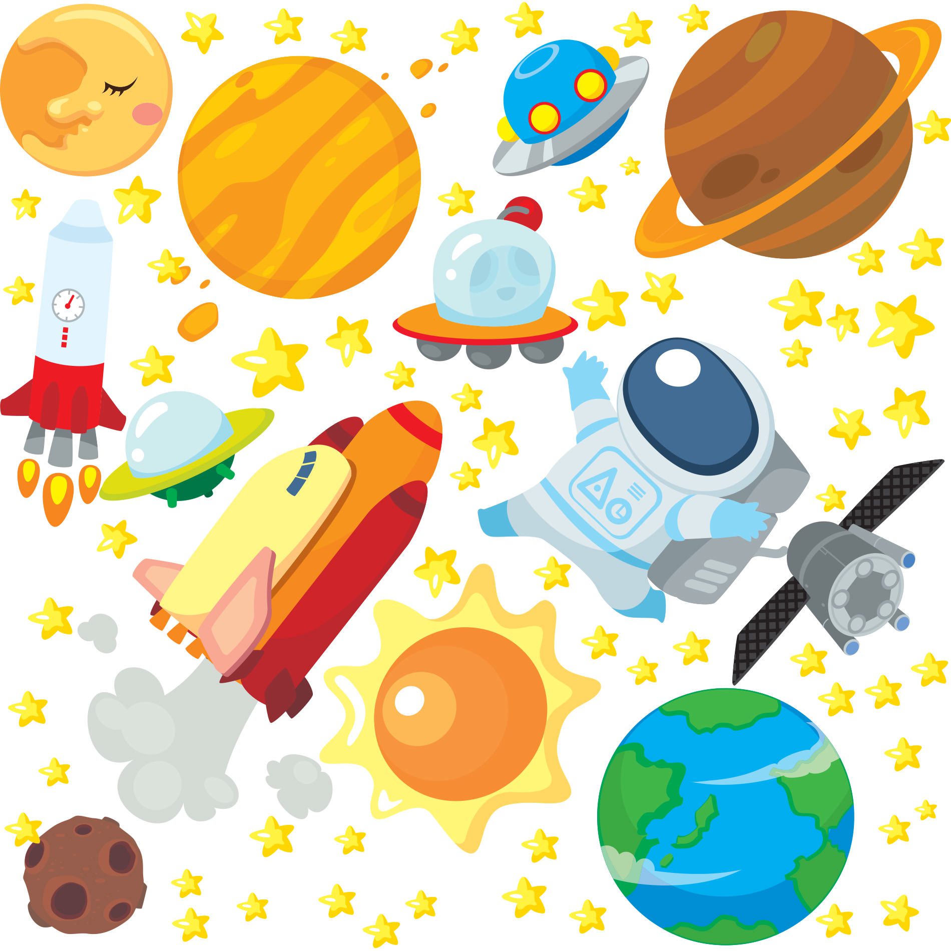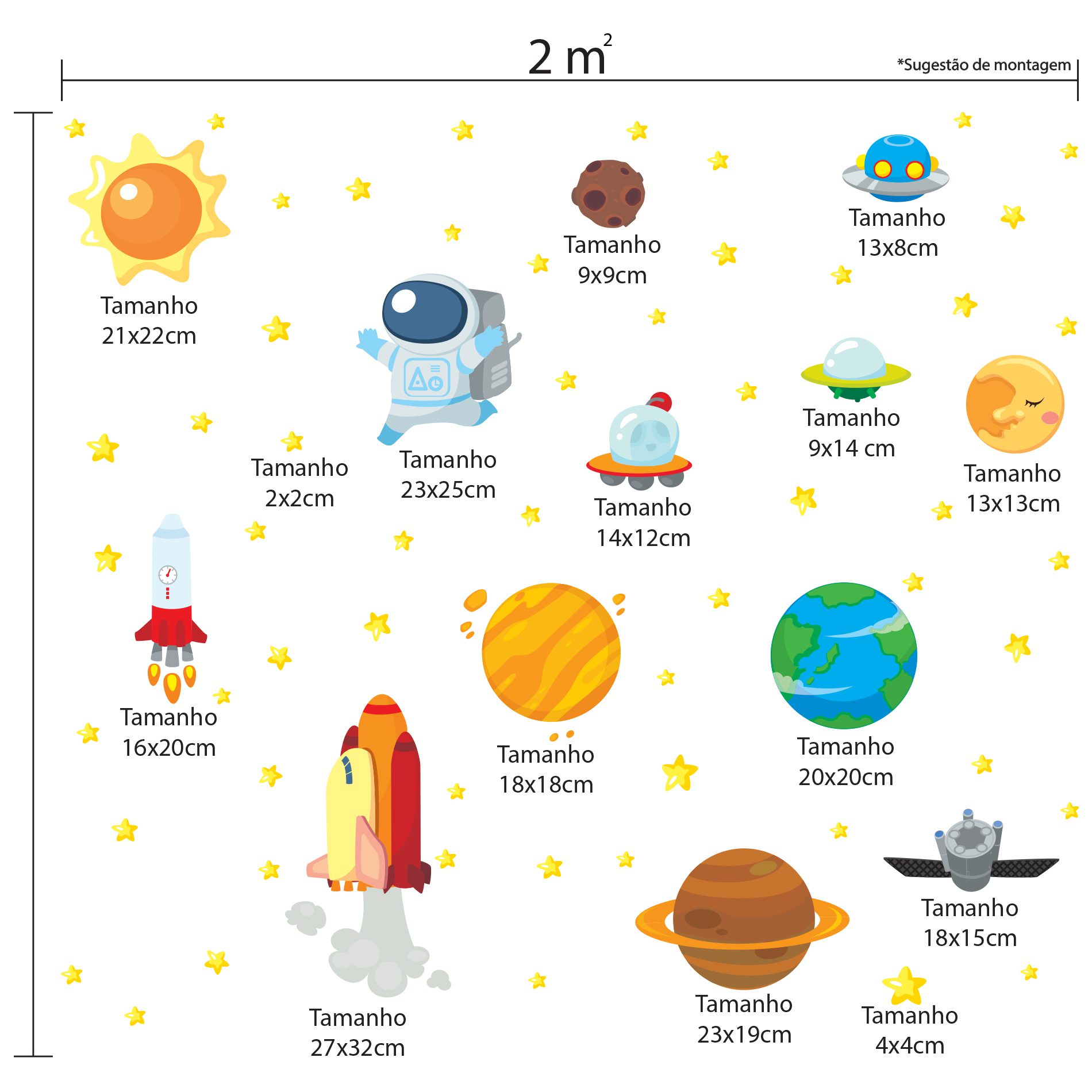 O kit de adesivo de parede planetas e astronauta contém 73 adesivos, sendo eles: