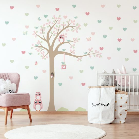 Adesivo de Parede Infantil Árvore Coruja Baby 1,85m Direita com corações