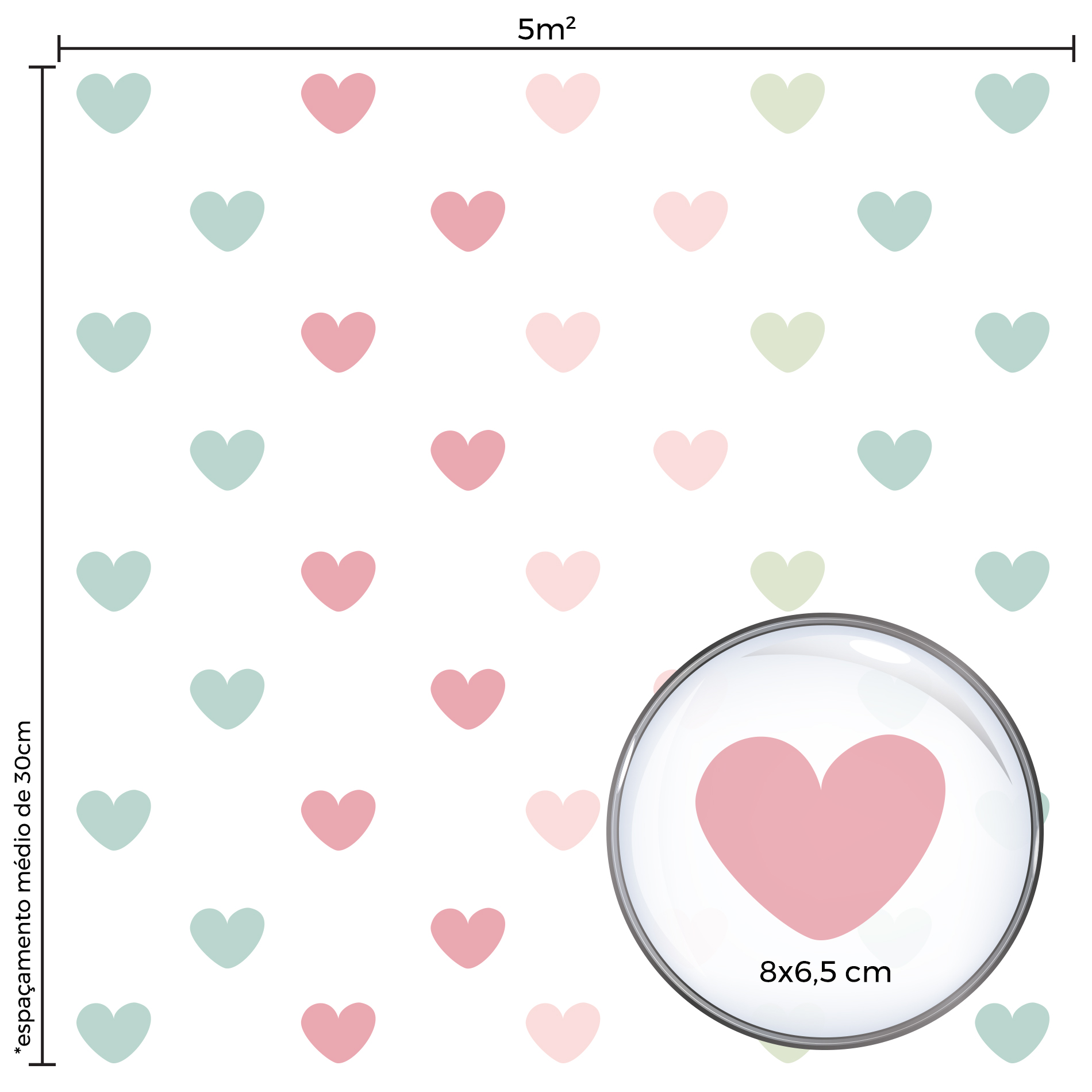 55 adesivos de corações de 8 cm x 6,5cm