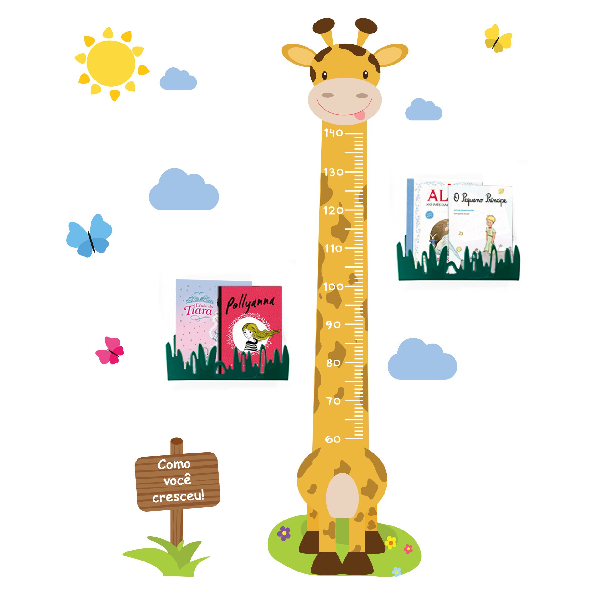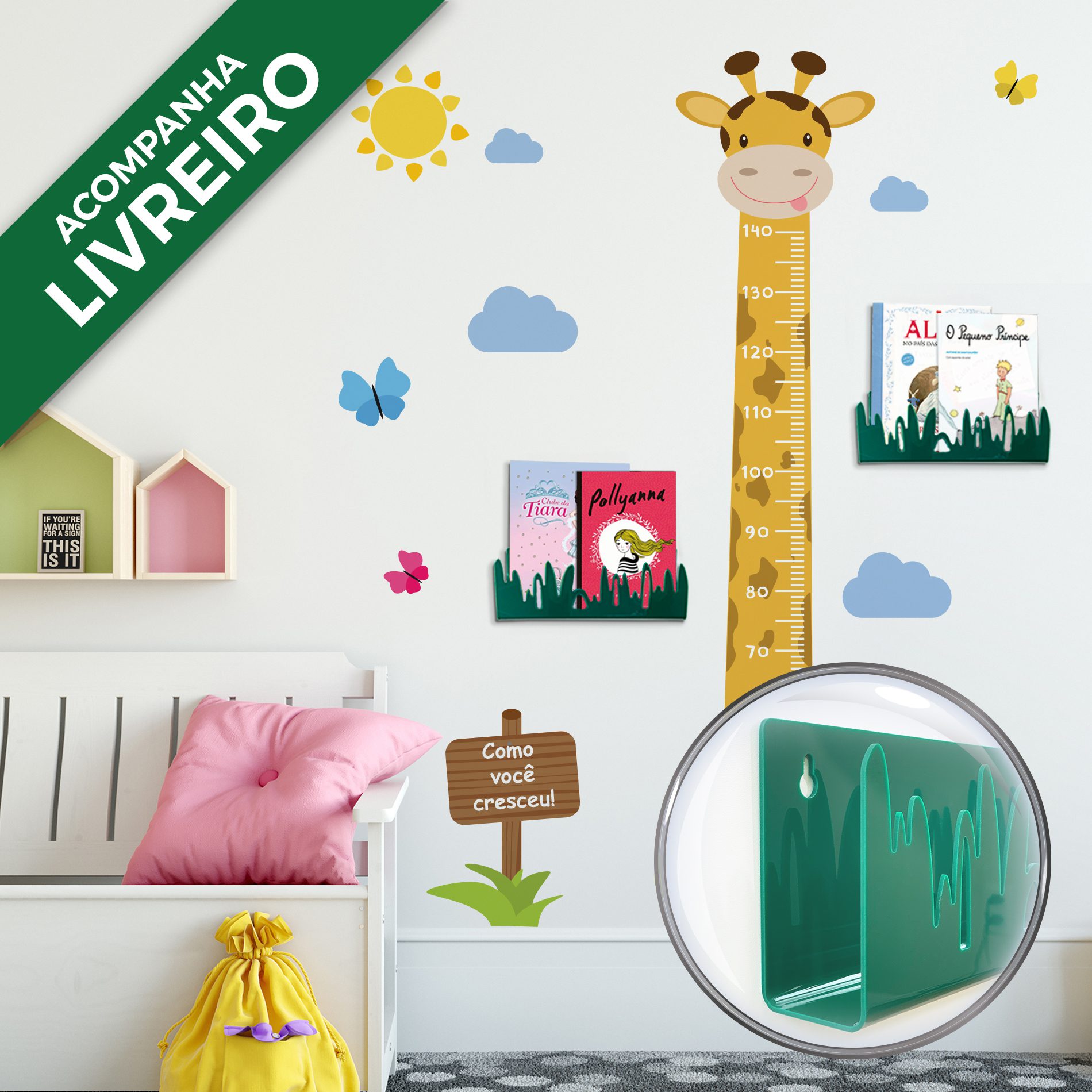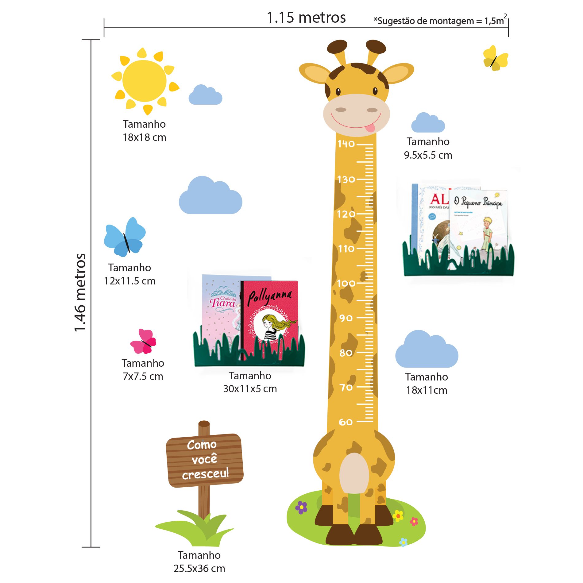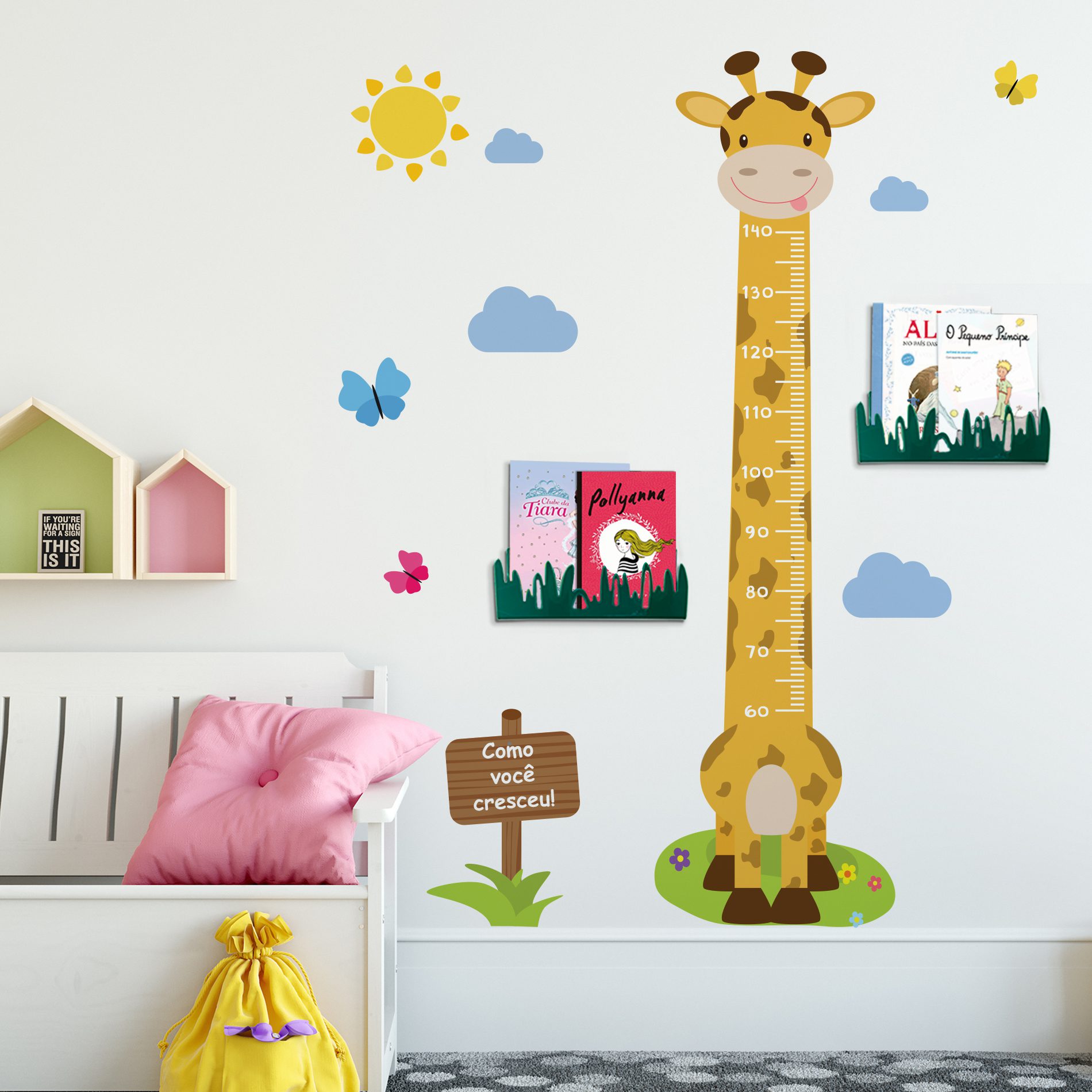 Características e dimensões do Adesivo de Parede Quarto Infantil Régua Girafa Com Livreiros: