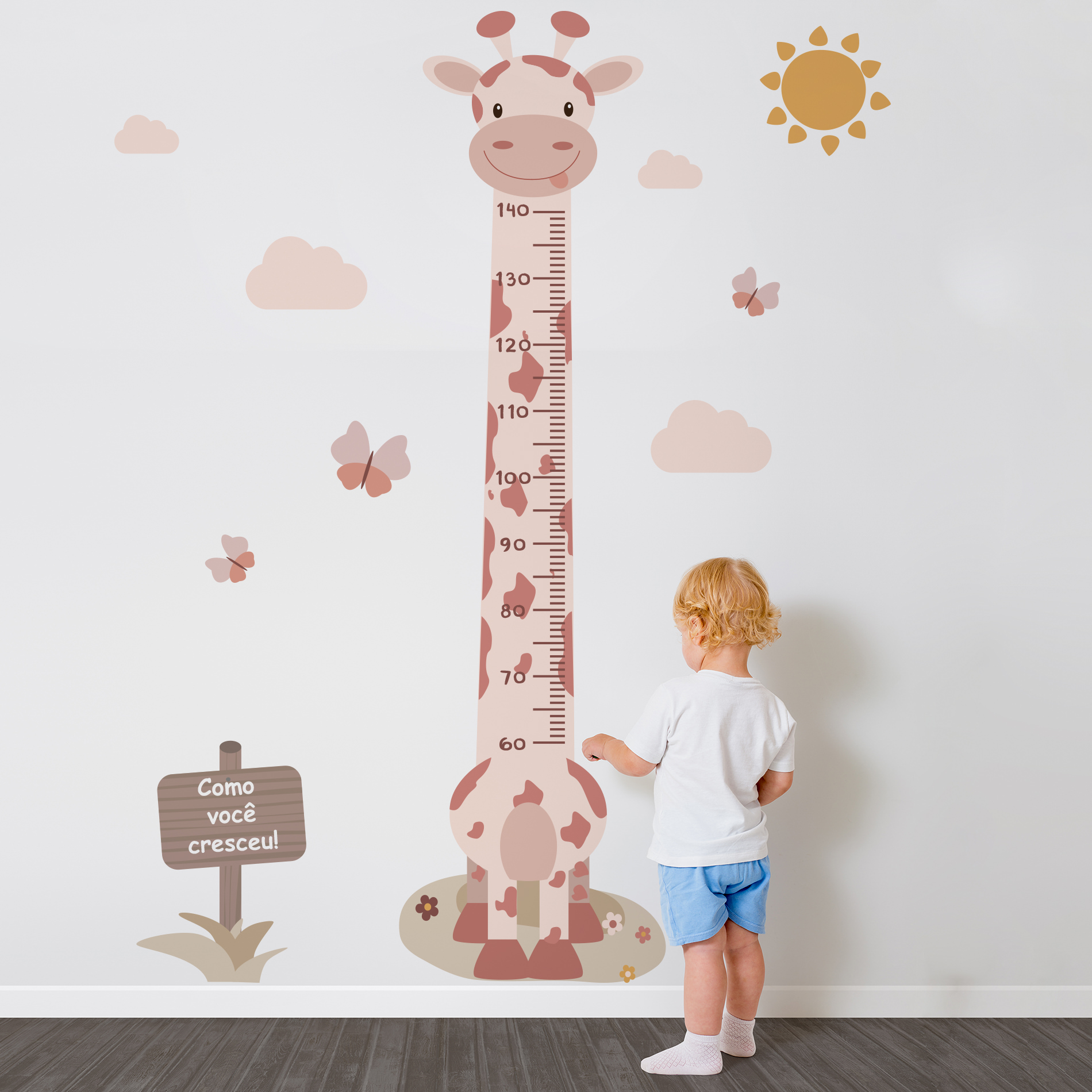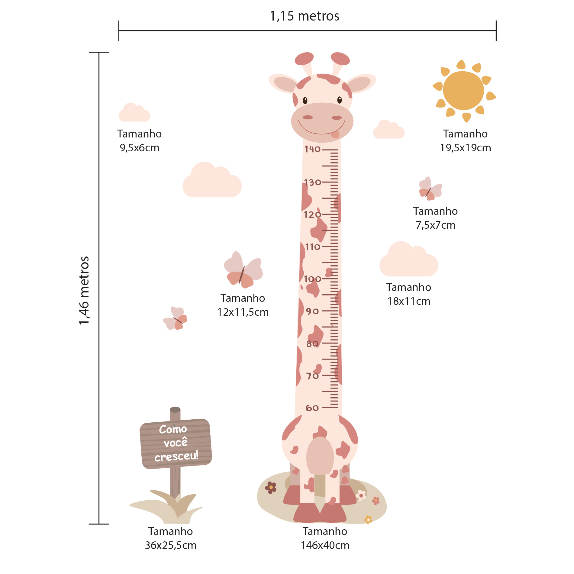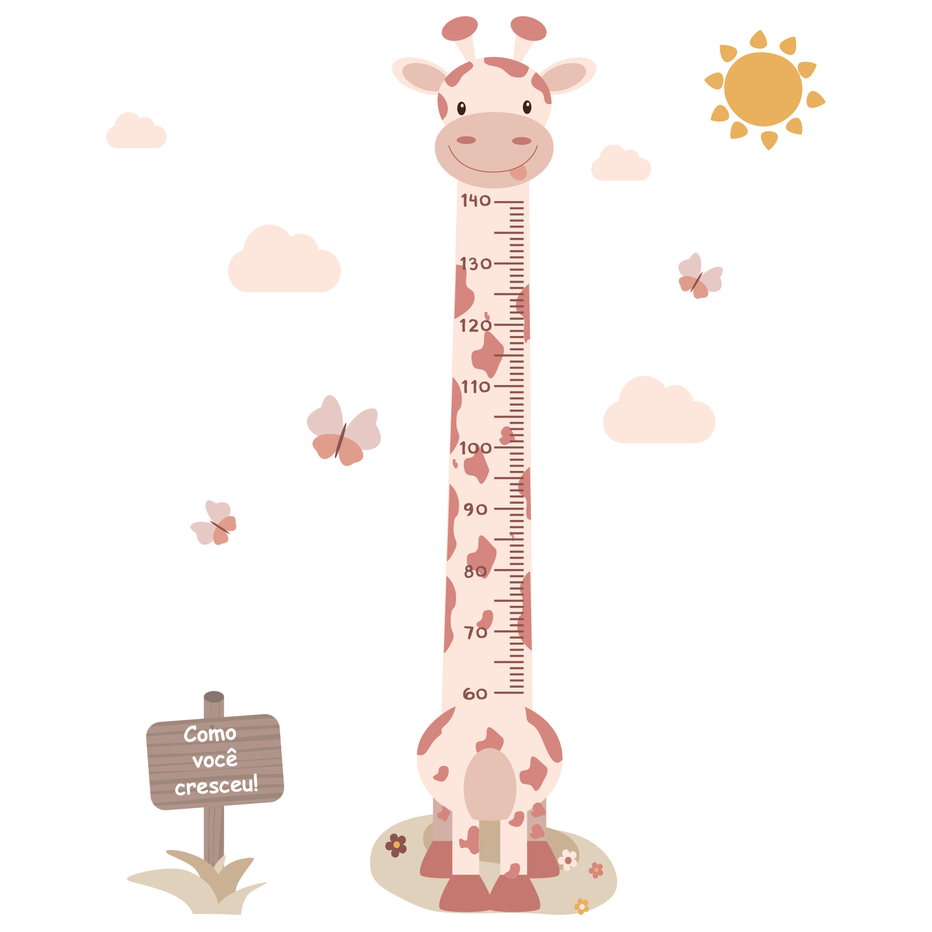 1 Girafa Régua, 3 Borboletas coloridas, 4 Nuvens, 1 Sol, 2 Gramas e 1 placa.
