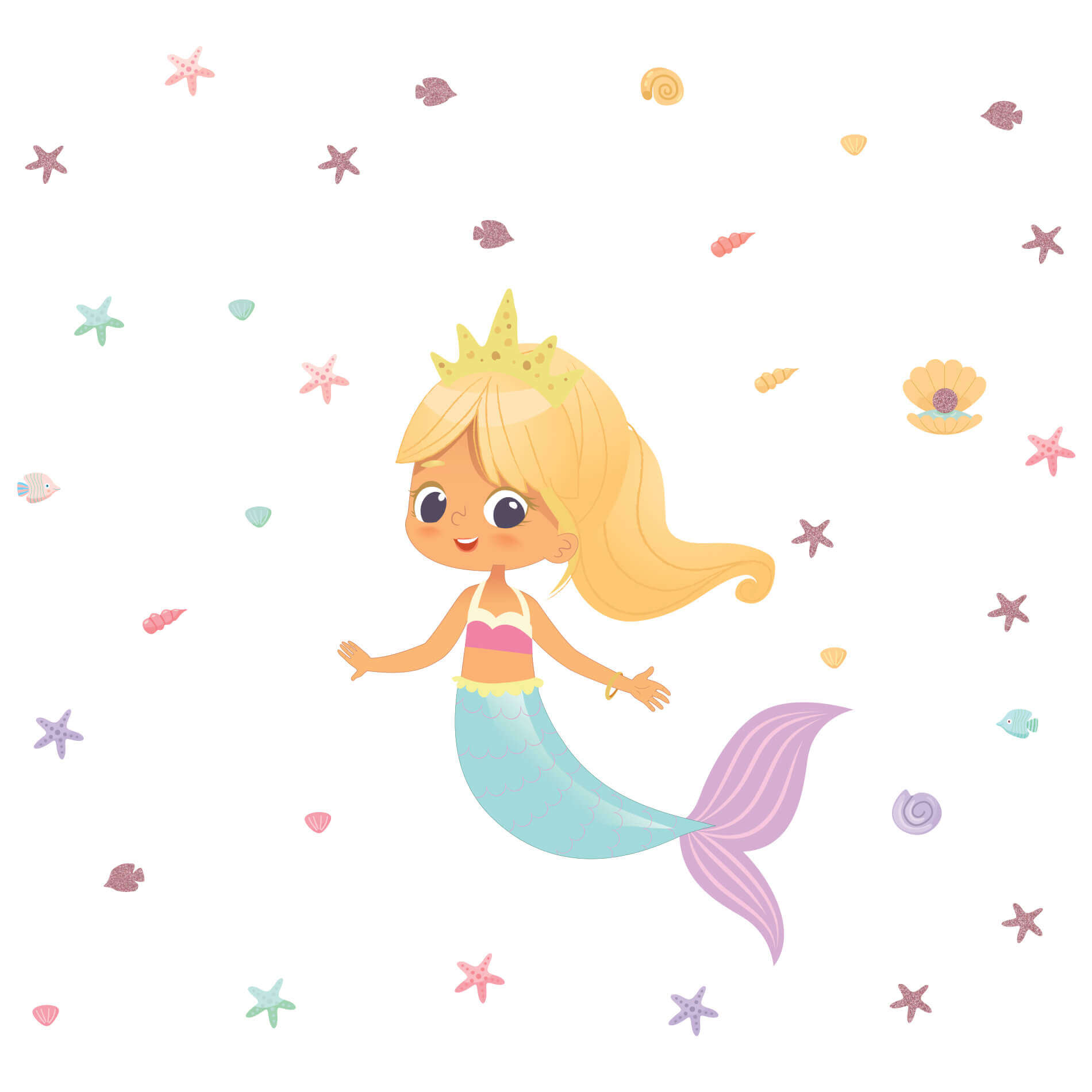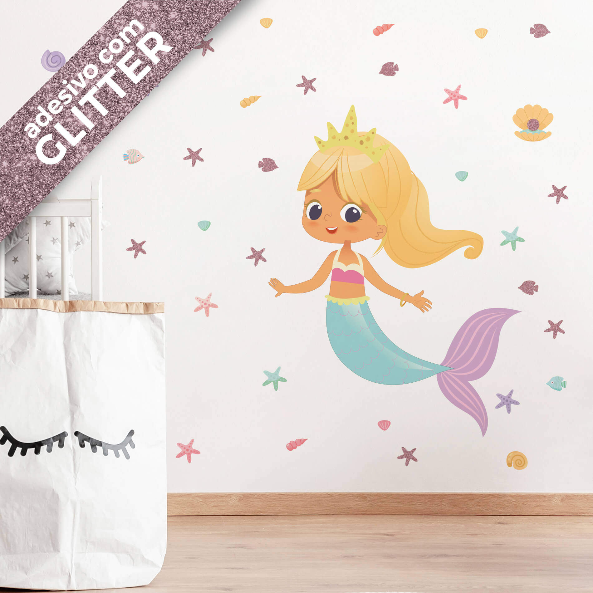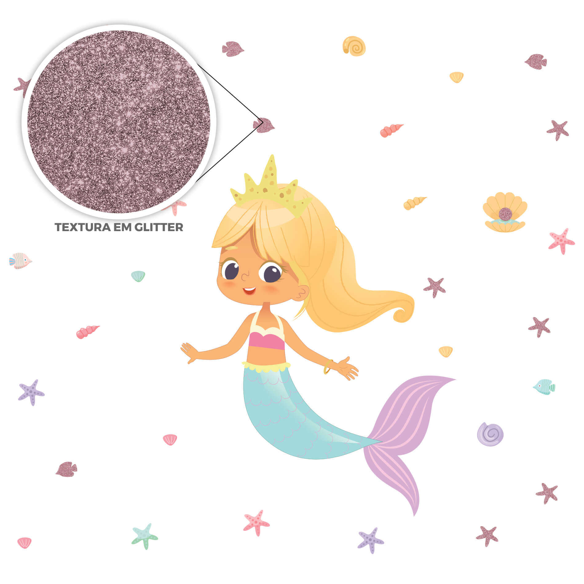 Adesivo de Parede Sereia Menina Loira Cabelo Liso Glitter