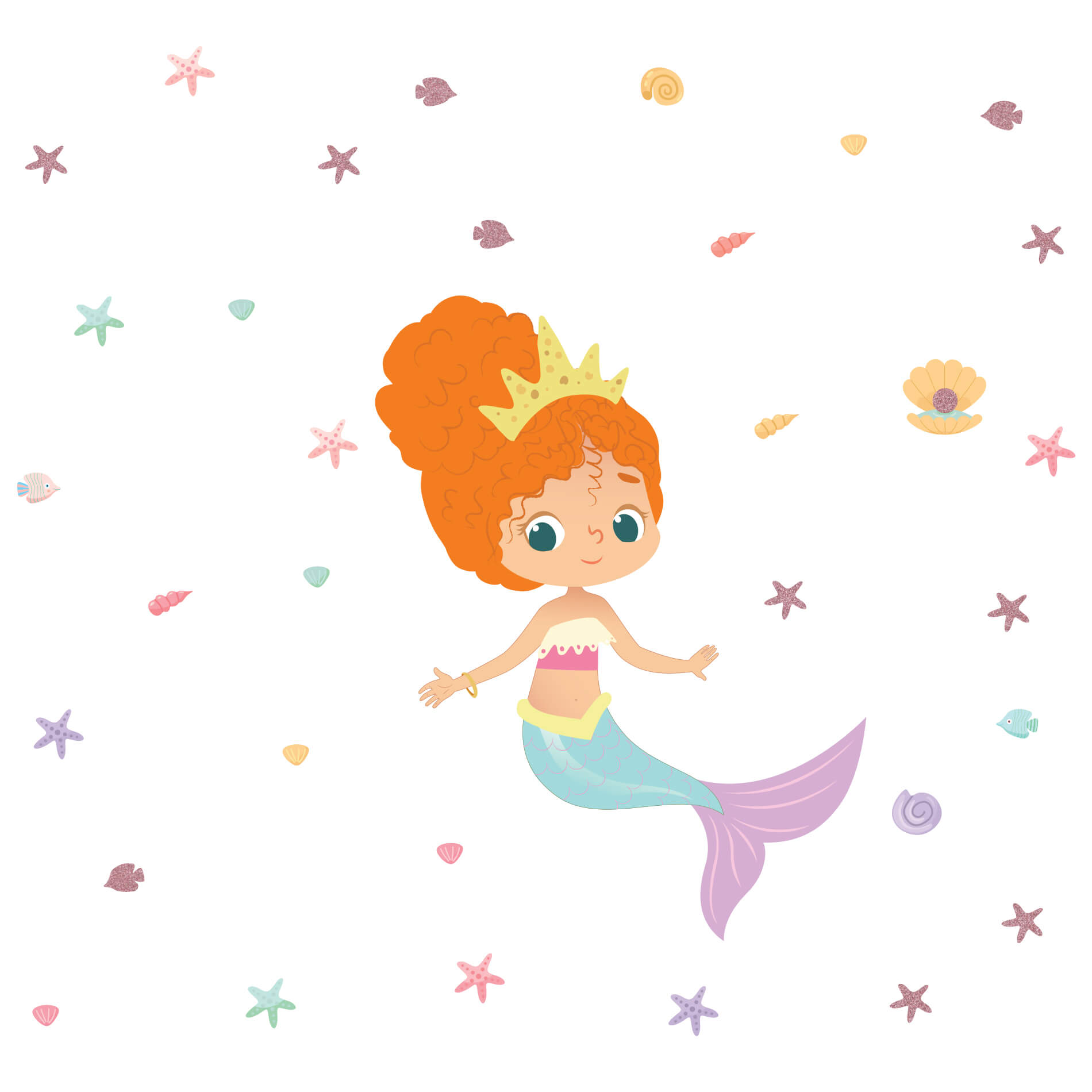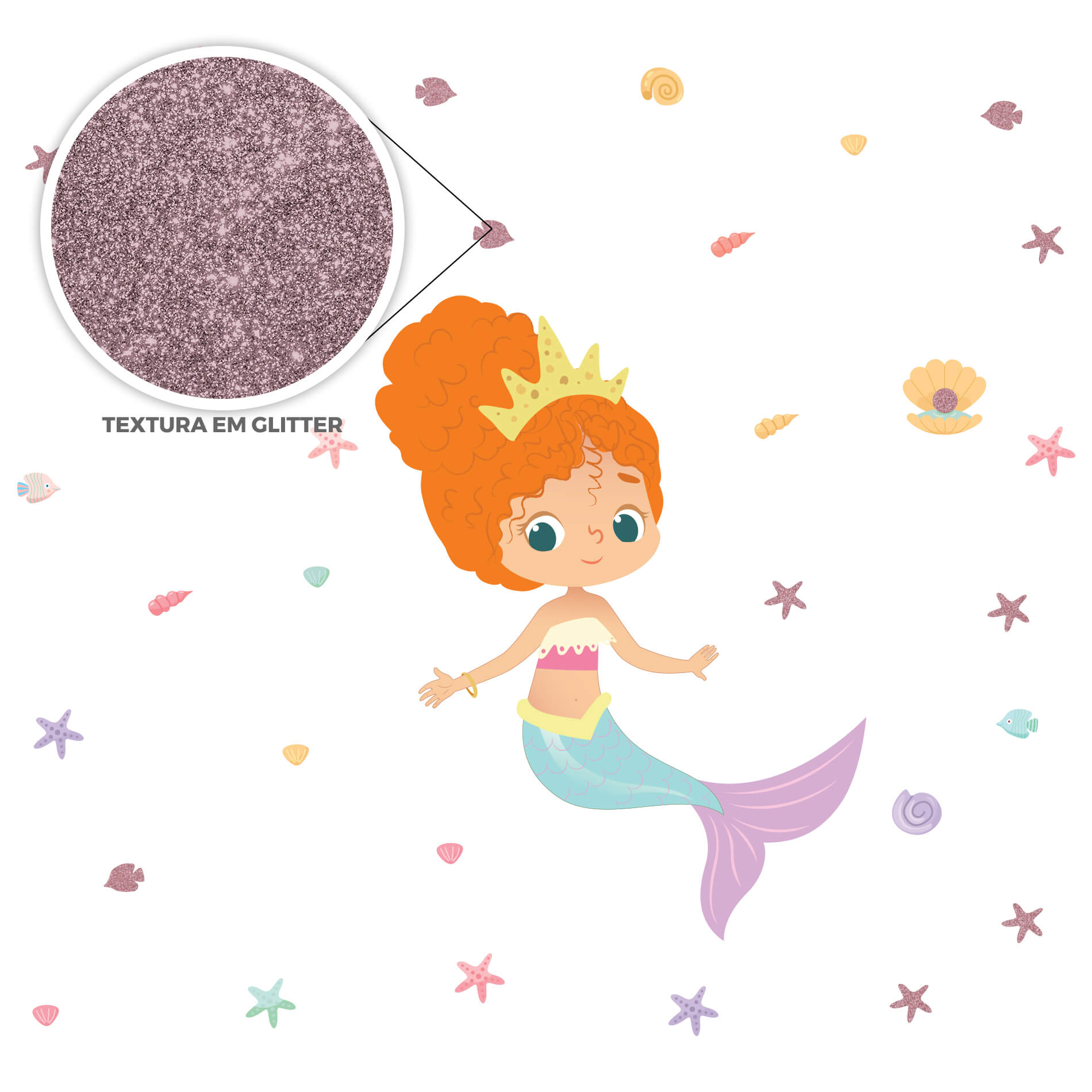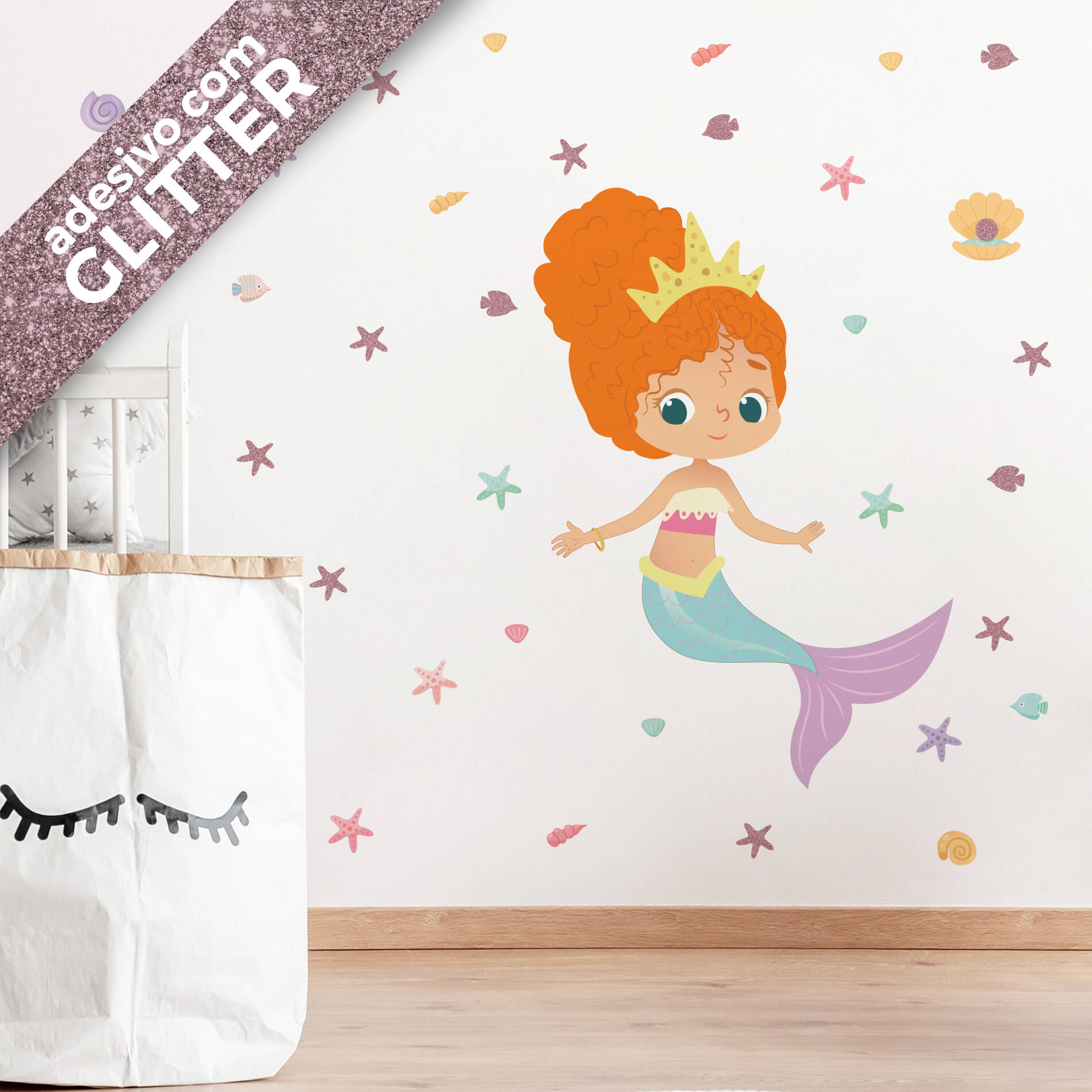 Adesivo de Parede Sereia Menina Ruiva Cabelo Cachos Glitter