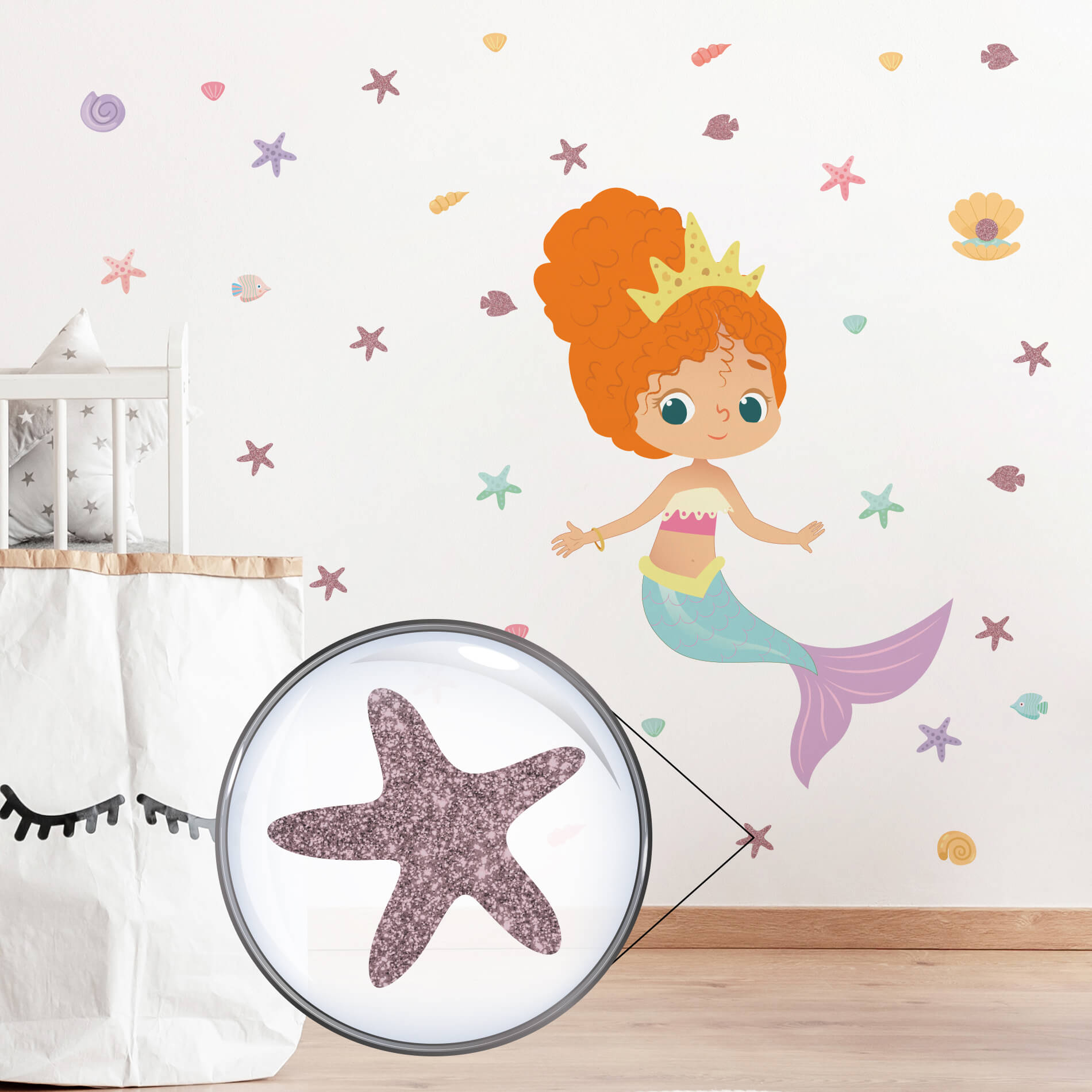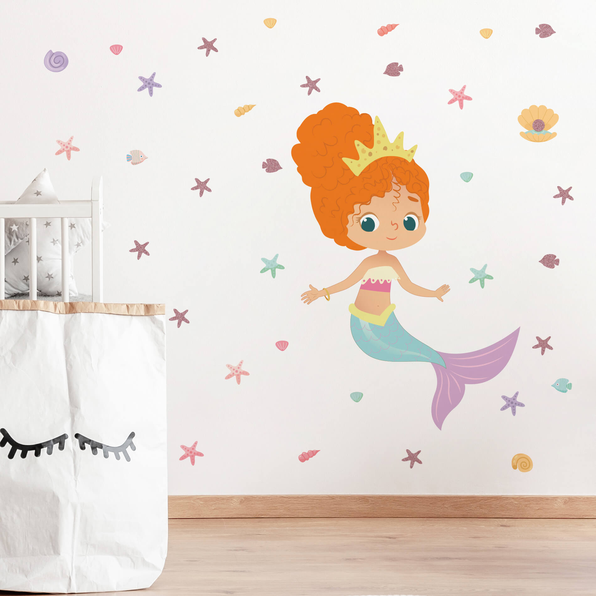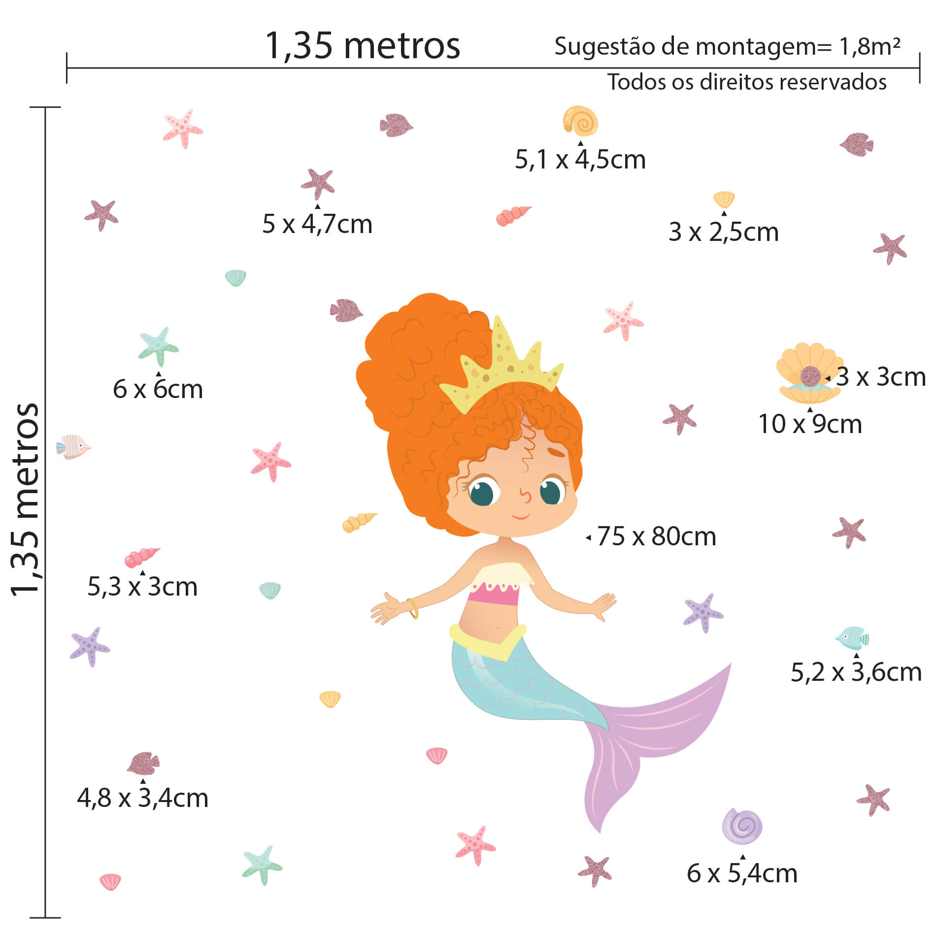 Adesivo de Parede Sereia Menina Ruiva Cabelo Cachos Glitter