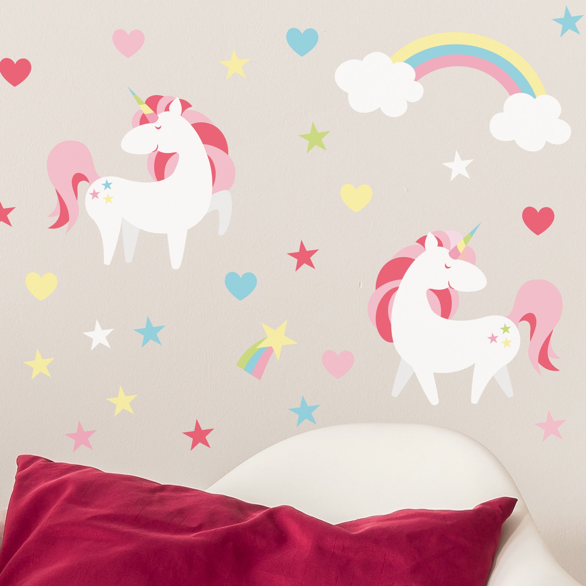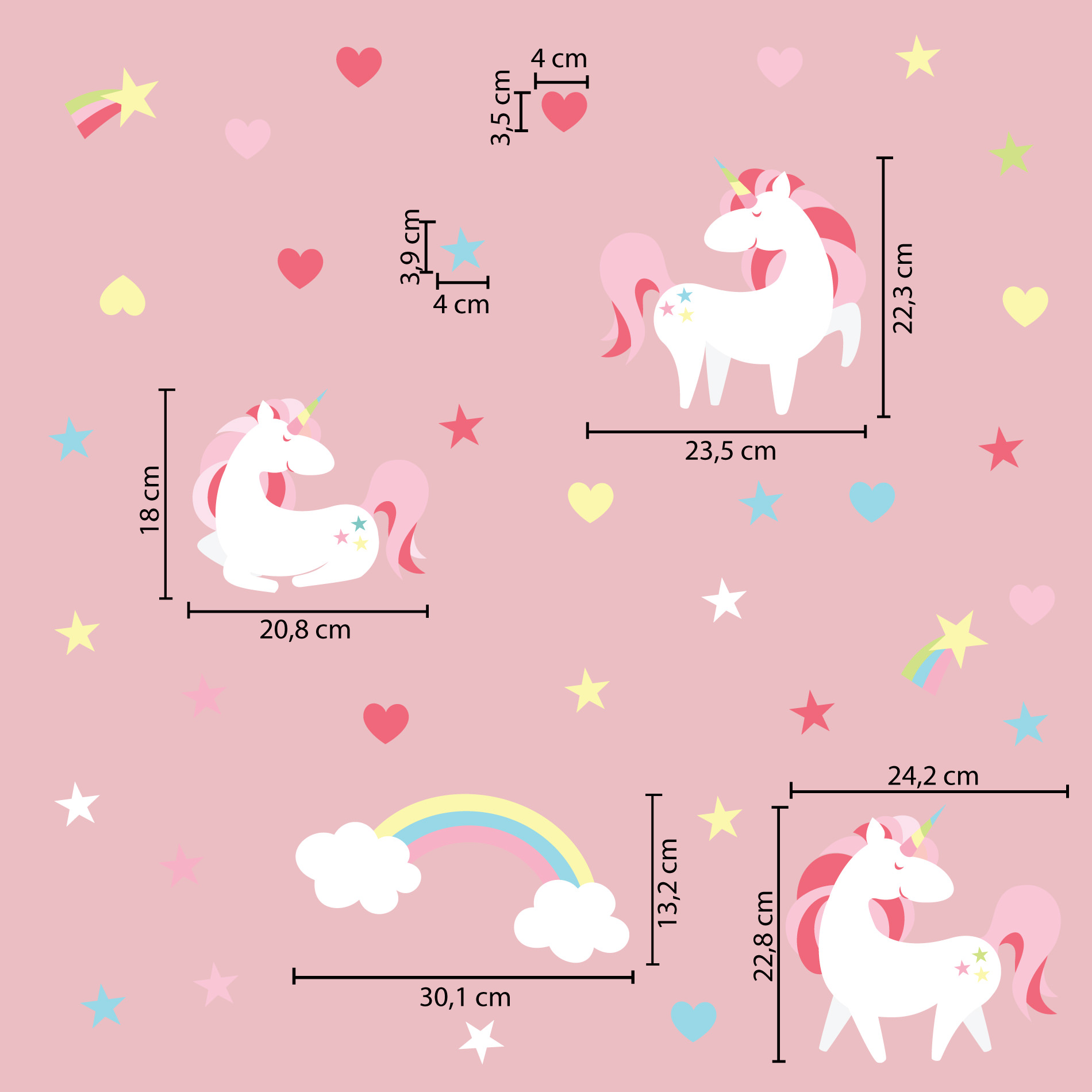 – O Conjunto de Adesivos contém: 3 unicórnios 23x23cm; 1 arco-íris 30x12cm; 12 corações 4x4cm; 15 estrelinhas 4x4cm e 2 cometas 8x6cm.