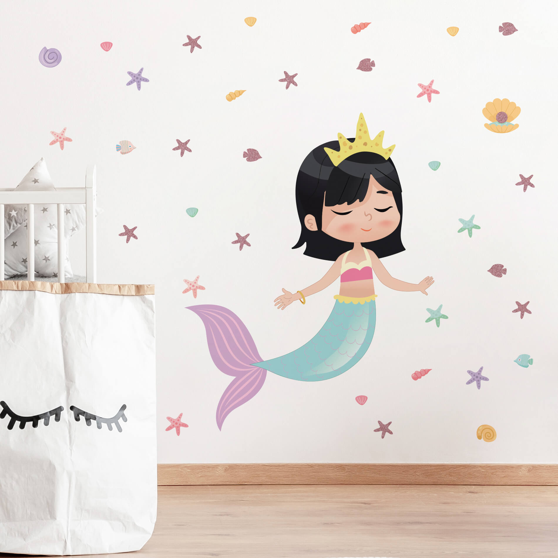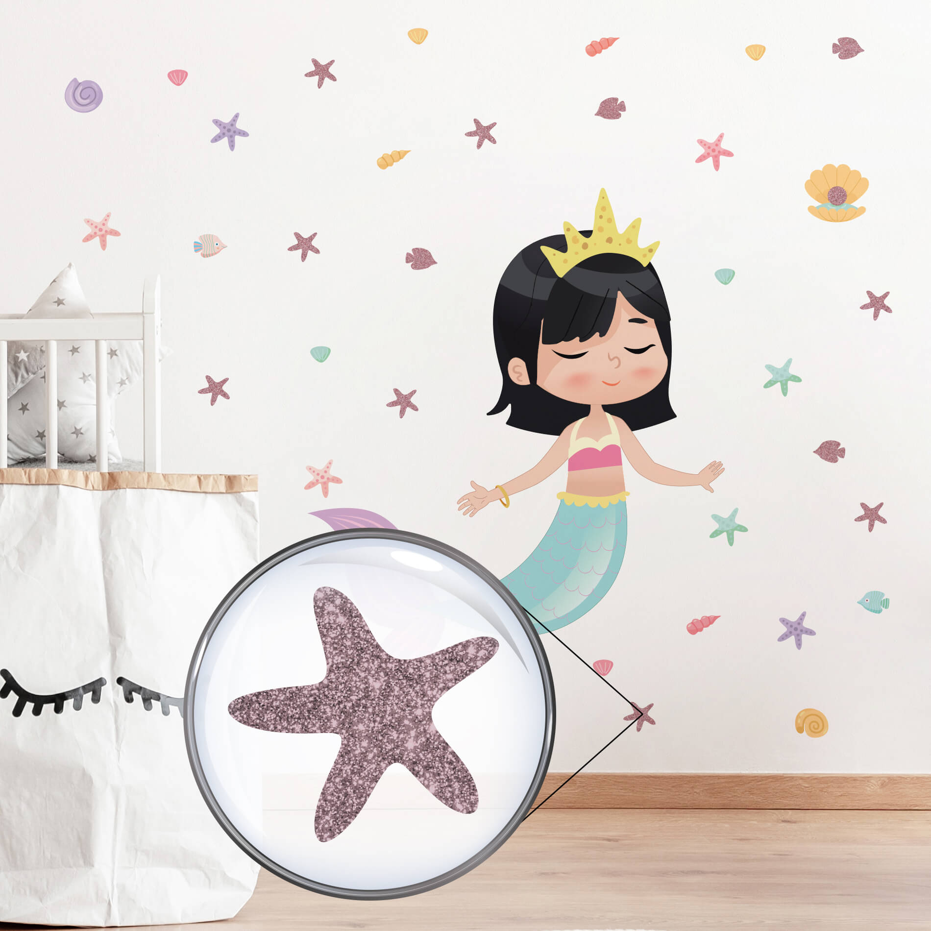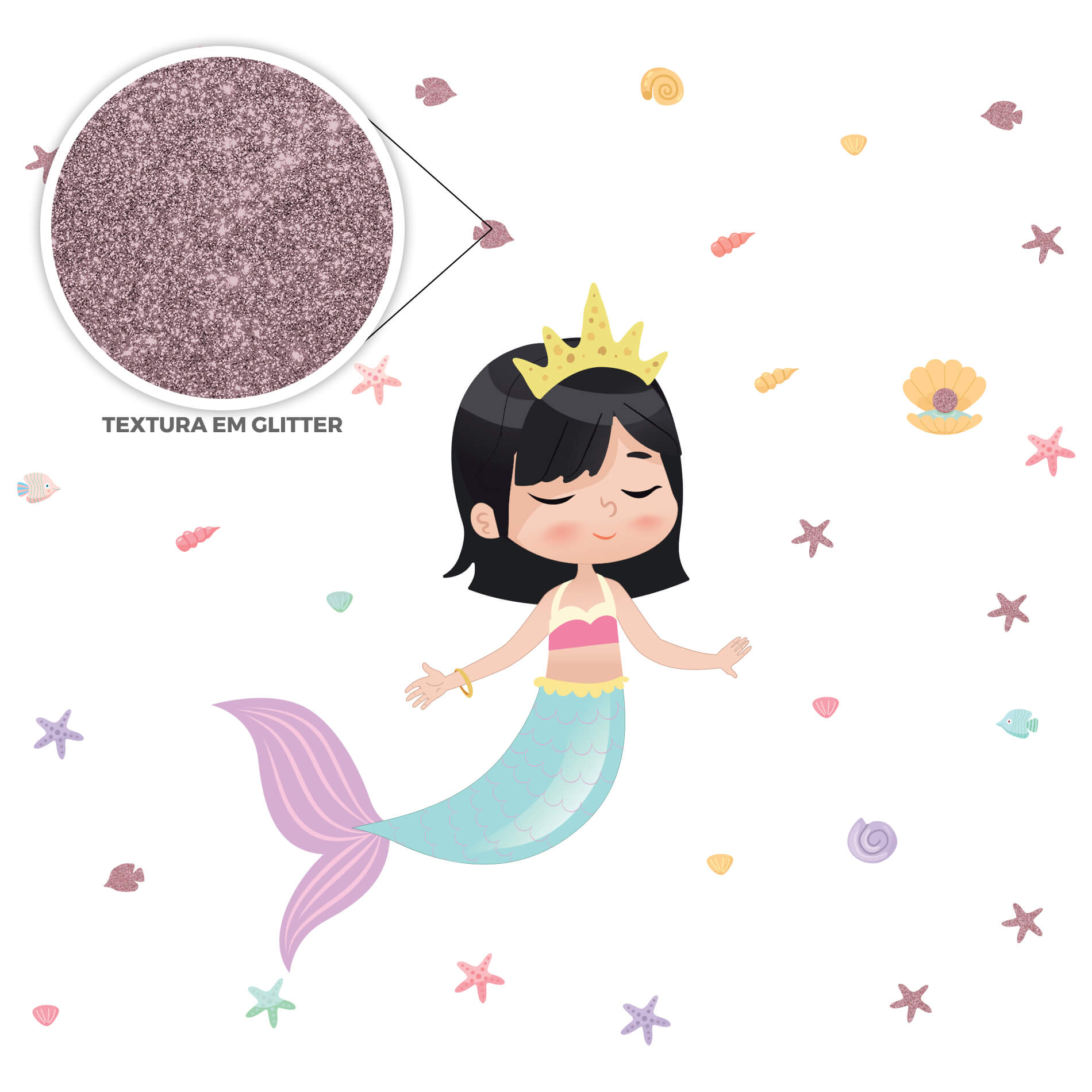 – 1 Adesivo de Parede Concha 10x9cm com Adesivo com glitter de 3cm;