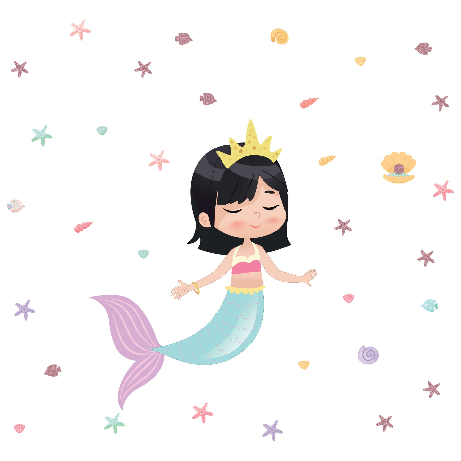 Adesivo de Sereia Menina Asiática Cabelo Preto Curto Glitter