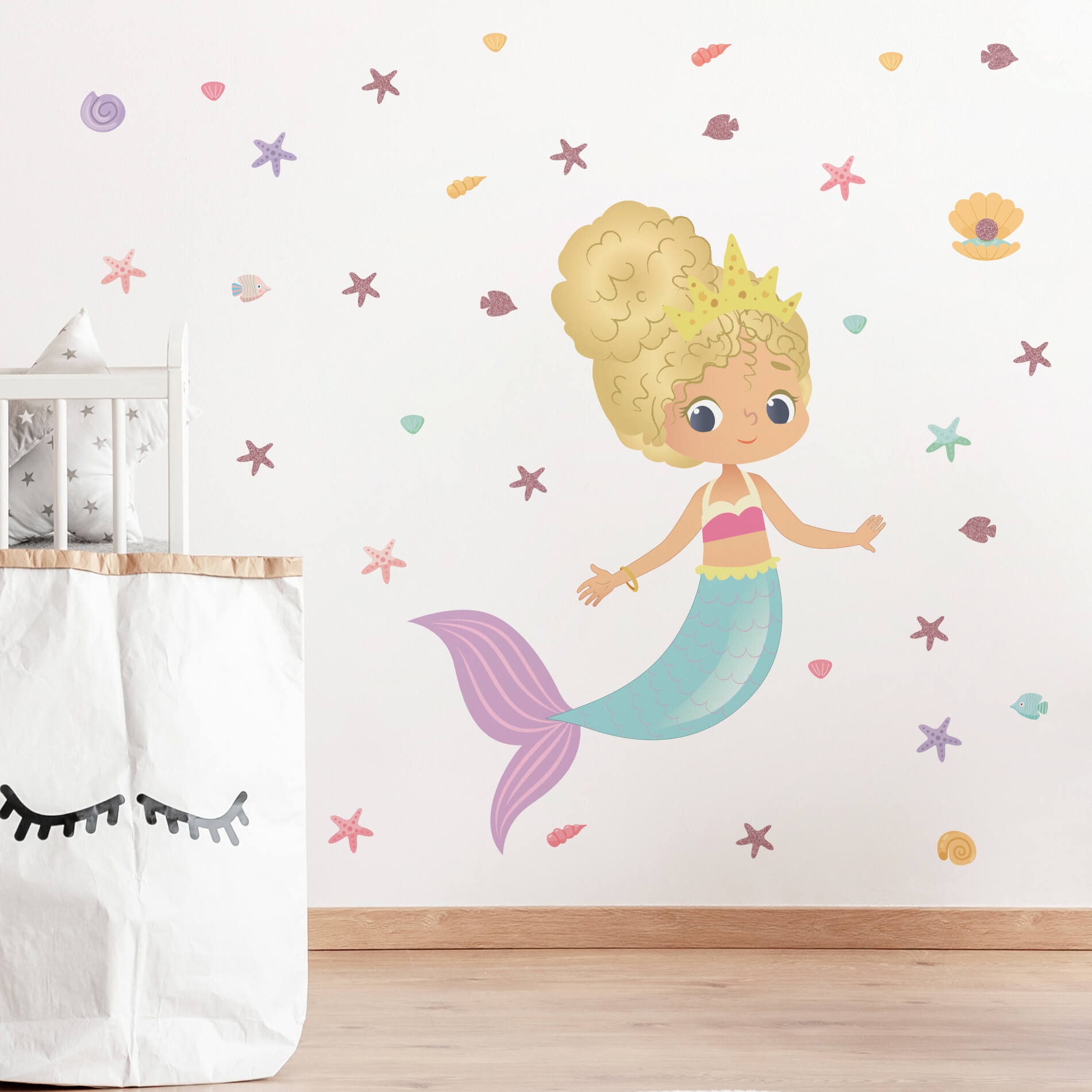 – 1 Adesivo de Parede Concha 10x9cm com Adesivo com glitter de 3cm;