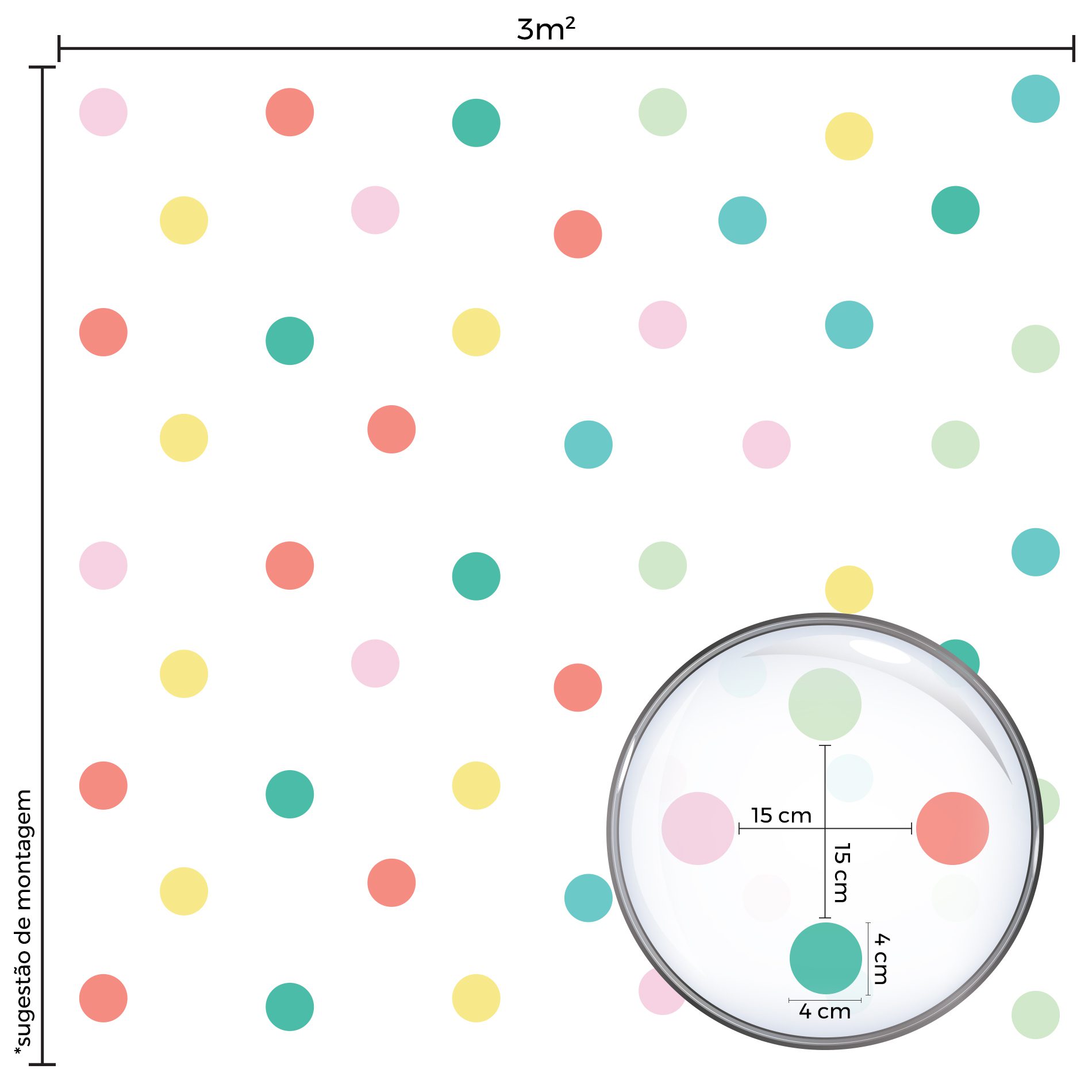 - O kit de adesivo de parede infantil bolinhas coloridas conte com 144 bolinhas 4 cm x 4 cm (cortadas individualmente), que cobrem 3 metros quadrados seguindo um espaçamento de 15cm entre as imagens, conforme a imagem;