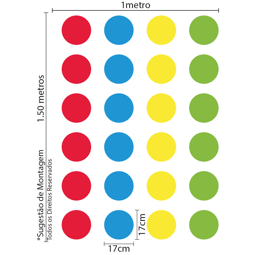 • Dimensões: Contém 24 adesivos de 17x17cm cada, cobrindo uma área total de 1×1,50m.
