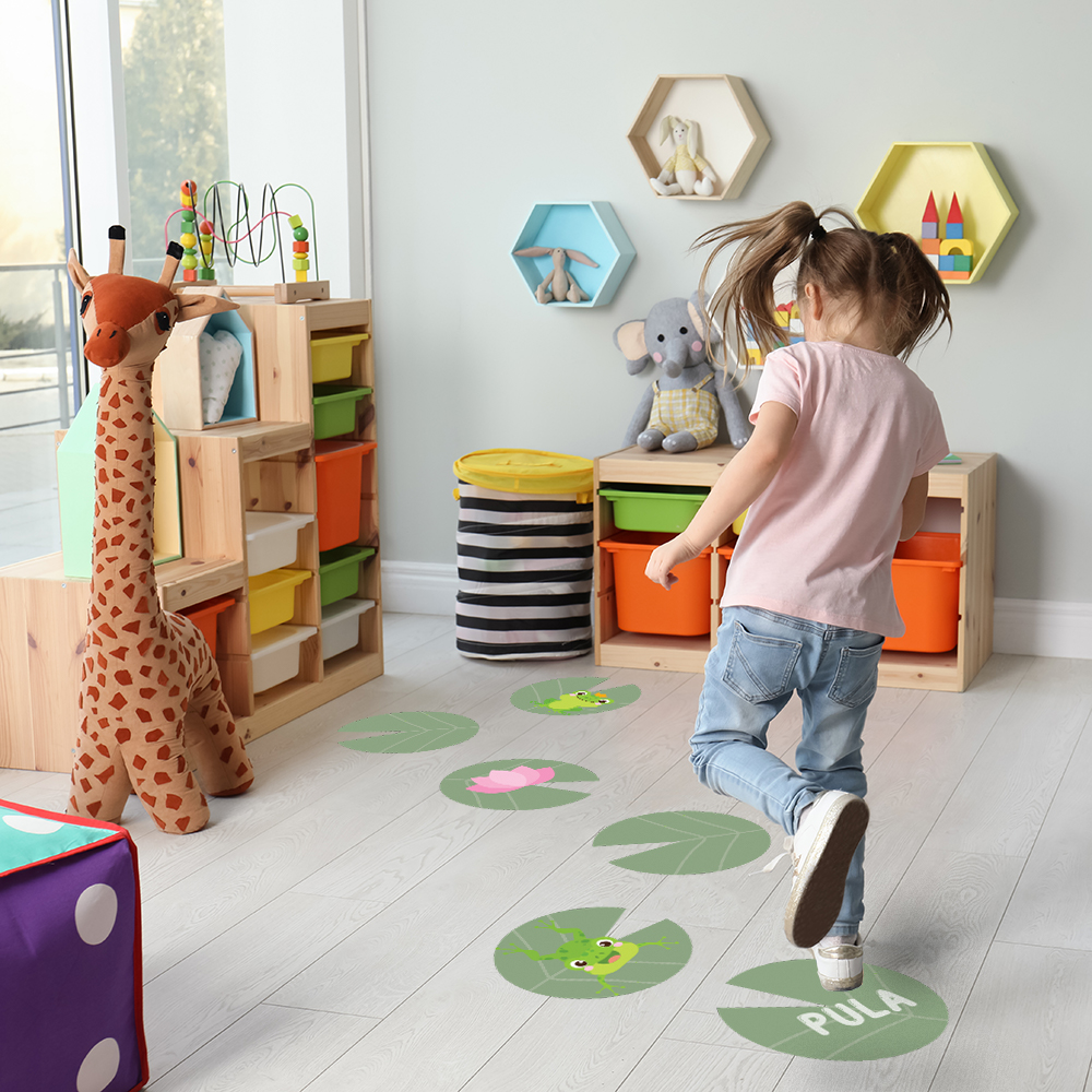 Adesivo de Chão Circuito do Sapo Pula Pula Folhas Verdes – Diversão Clássica em Qualquer Lugar!
