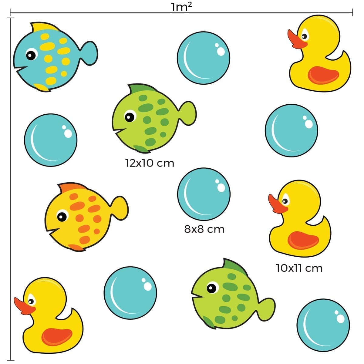 Os peixinhos e os patinhos vão agradar a todas as crianças. Os adesivos para piso são muito fáceis de aplicar, você pode até mesmo chamar as crianças para que elas participem do processo todo da decoração!
