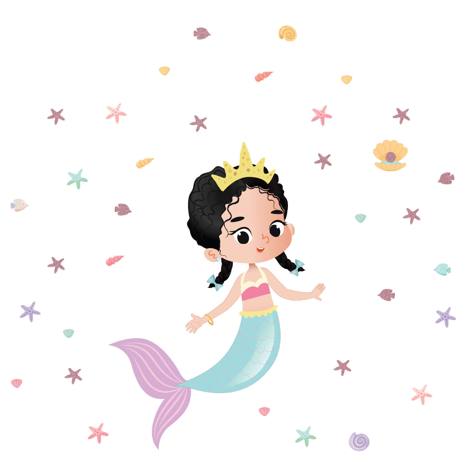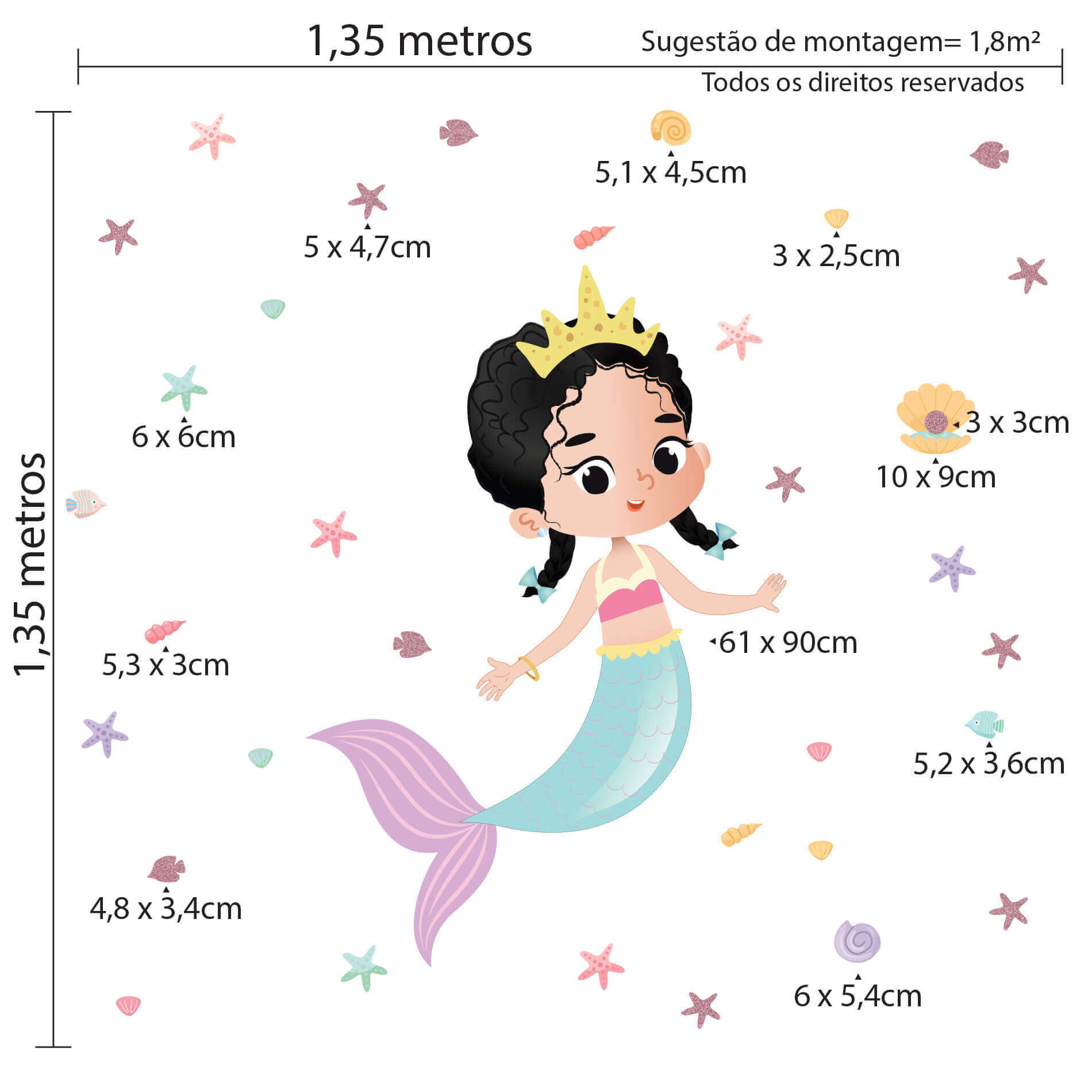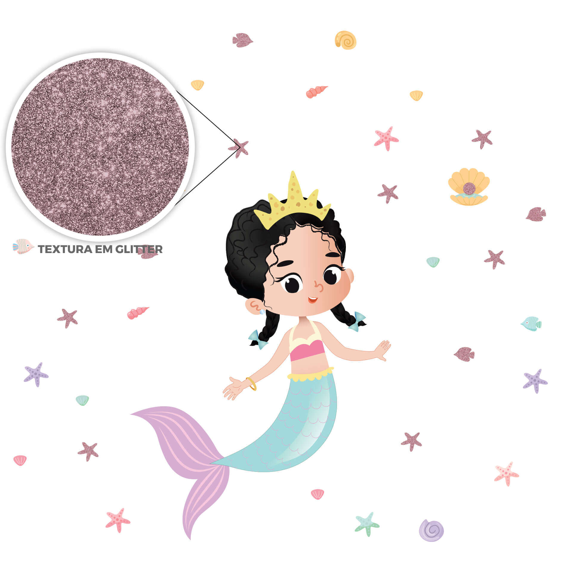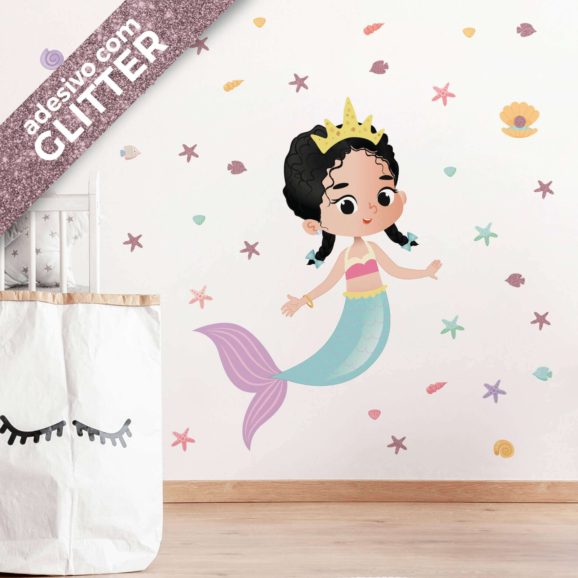 Adesivo Sereia Infantil Menina Cabelo Preto Trança Glitter
