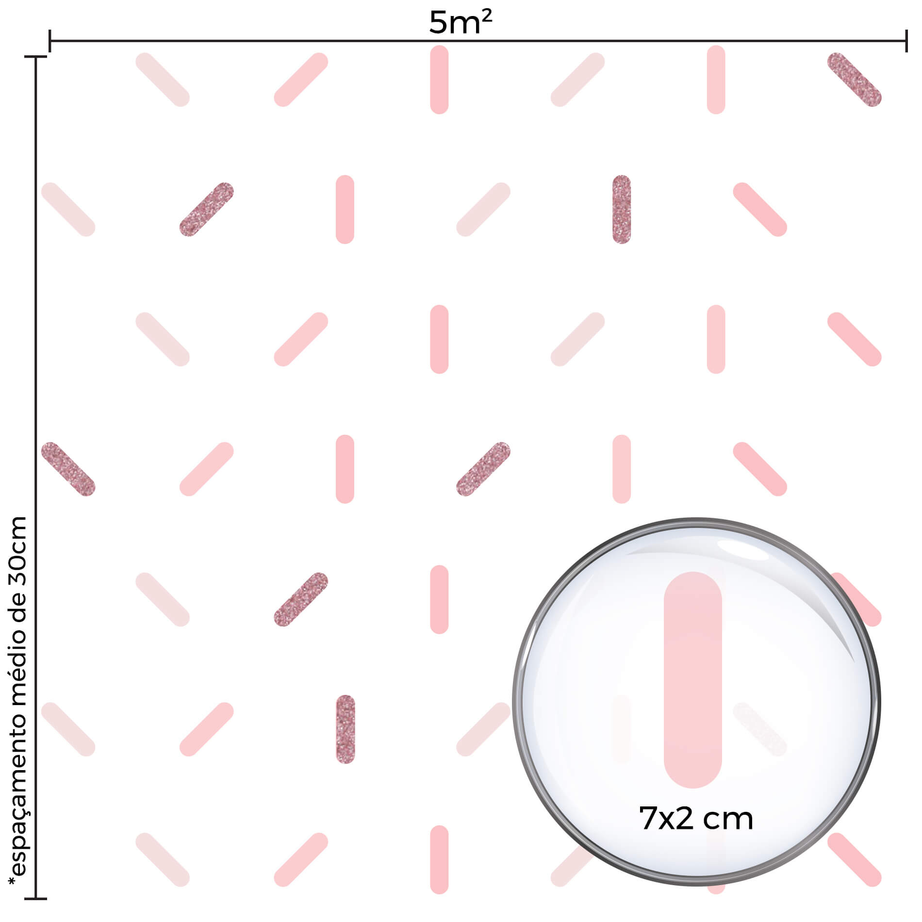 Este kit contém 154 adesivos que montados conforme a imagem, com 20cm de espaçamento médio entre eles cobrem uma área de 5m².