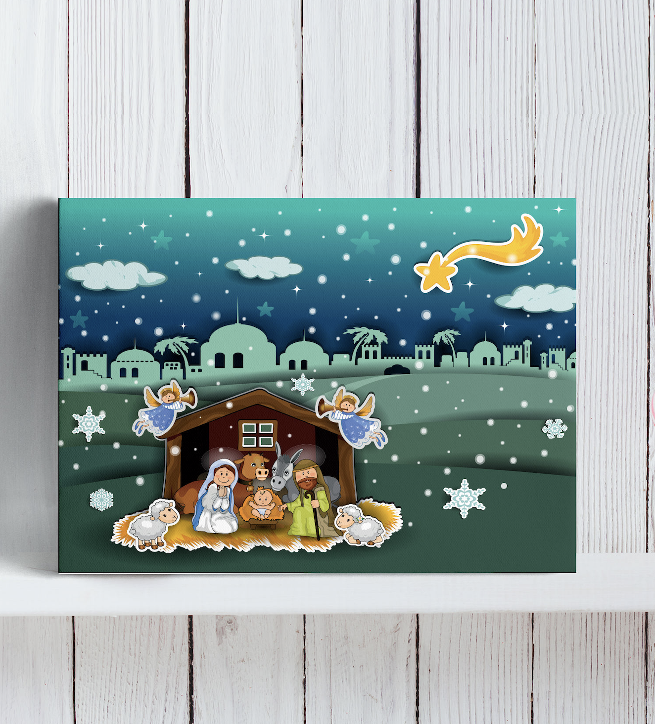 A placa decorativa representa o cenário do presépio e pode ser colocado na parede ou encostado em um aparador, da maneira que mais combinar com a decoracão de Natal da sua casa.