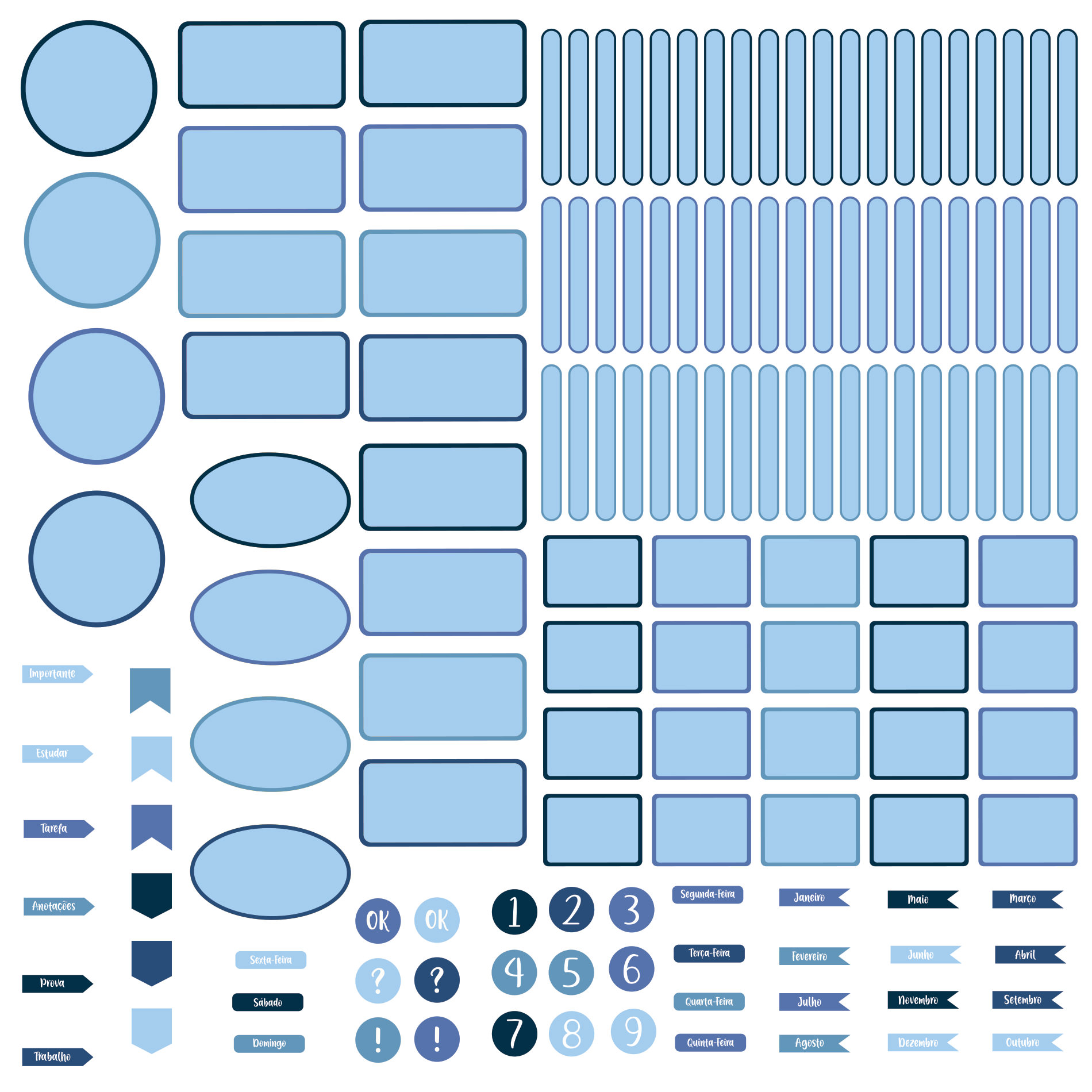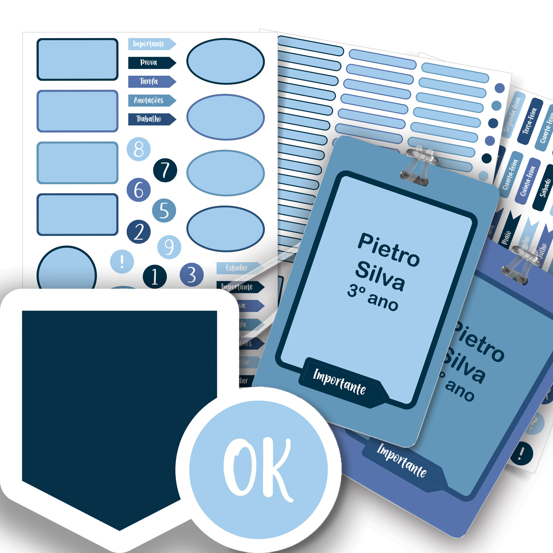 O kit de Etiquetas Escolares Tons de Azul vem com 146 Adesivos distribuídos em: