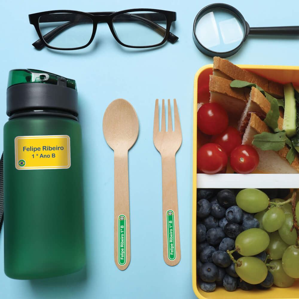 As etiquetas escolares são à prova d’água e podem ser coladas em copinhos, estojos de escova de dentes, etc.