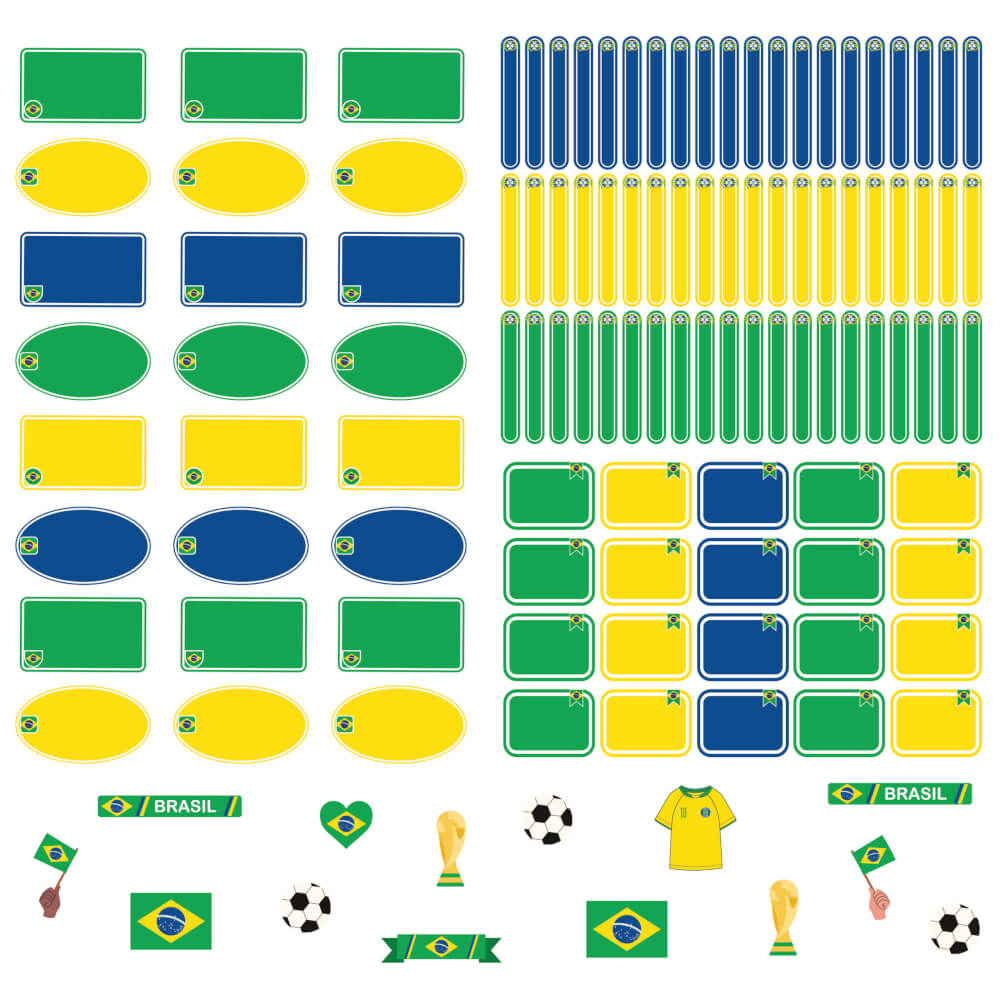 O kit de etiquetas escolares Copa do Mundo vem com 118 adesivos escolares distribuídos em: