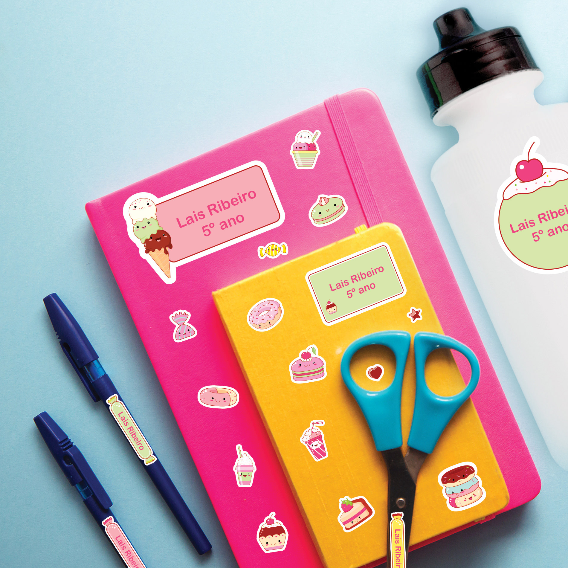 As etiquetas escolares são à prova d’água e podem ser coladas em copinhos, estojos de escova de dentes, etc.