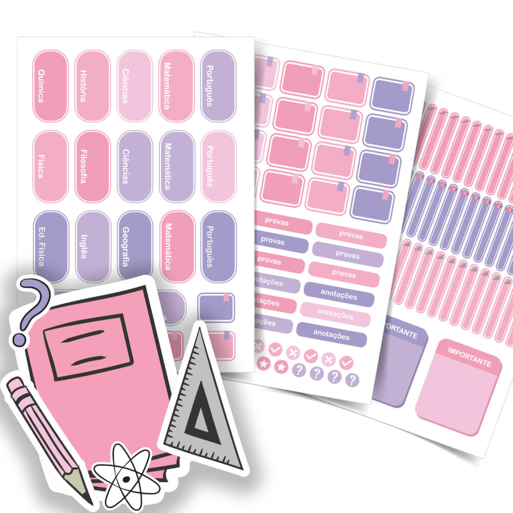 Além das etiquetas escolares, o kit vem com adesivos sortidos e divertidos para a criançada colar no caderno, na agenda, no estojo e brincar à vontade.