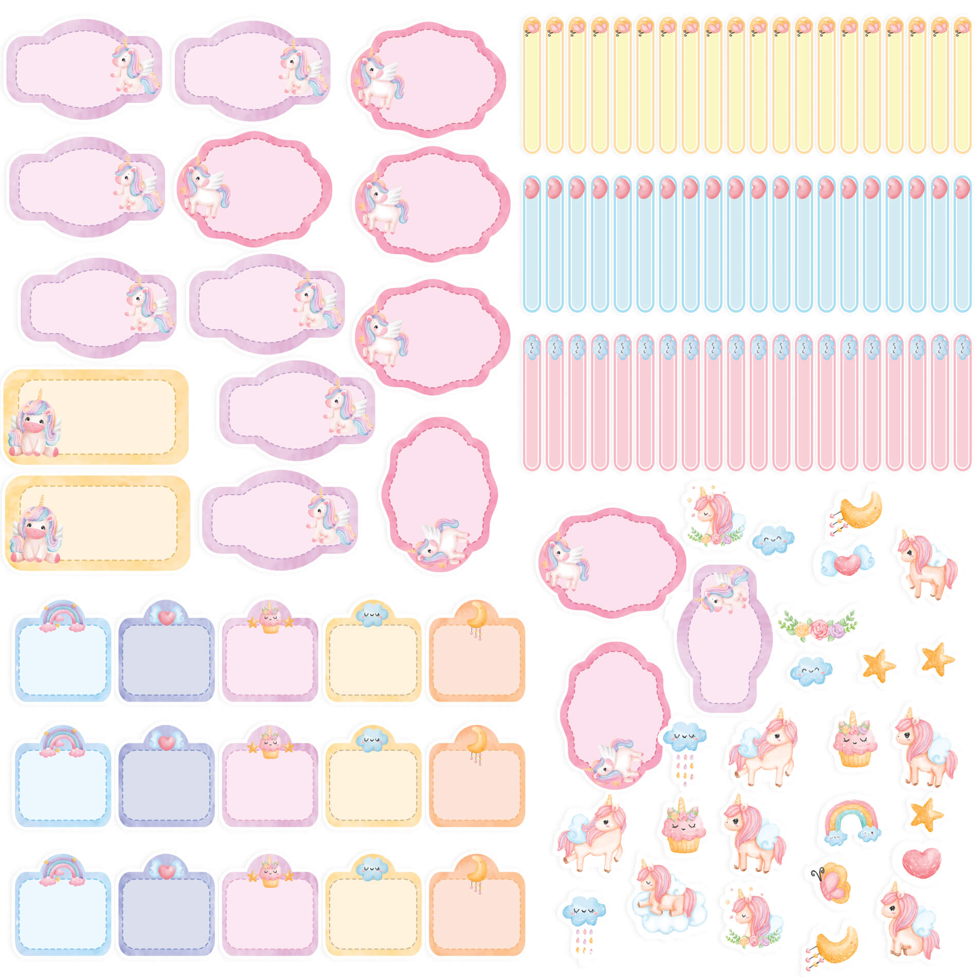 O kit de Etiquetas Escolares vem com 122 etiquetas escolares distribuídas em: